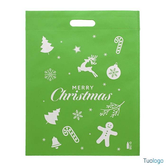 Borsa shopper natalizia RPET. Con disegno di Natale in TNT 80 gr. Dimensioni: cm 34x44.