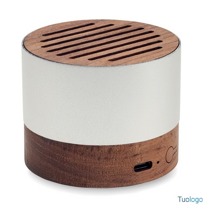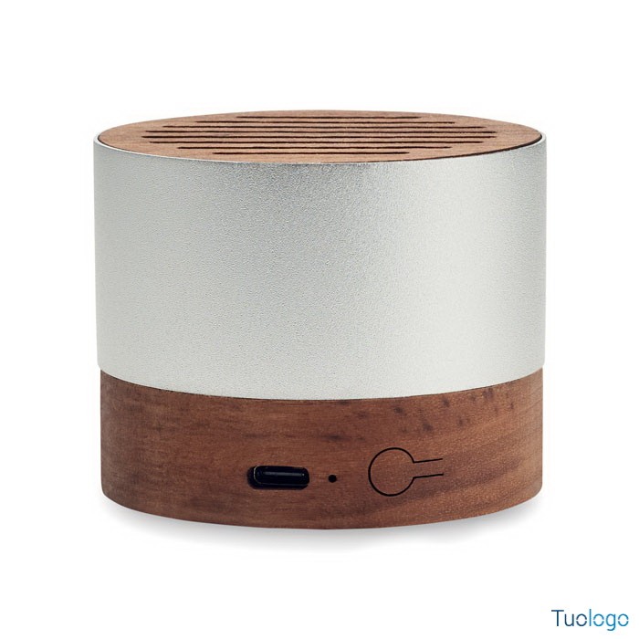 Speaker wireless in alluminio Pacay. Speaker wireless con involucro in alluminio riciclato e dettagli in noce sulla base e sulla parte superiore. 1 batteria ricaricabile Li-ION 300 mAh inclusa. Dimensioni: diam cm 6,9x5.