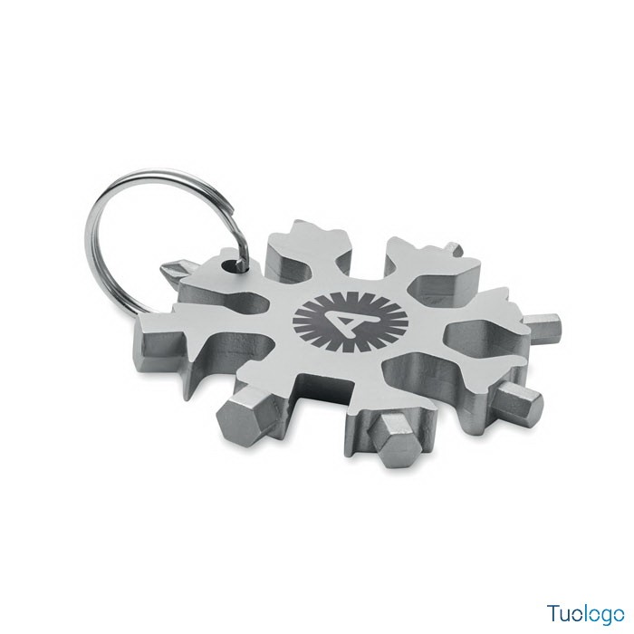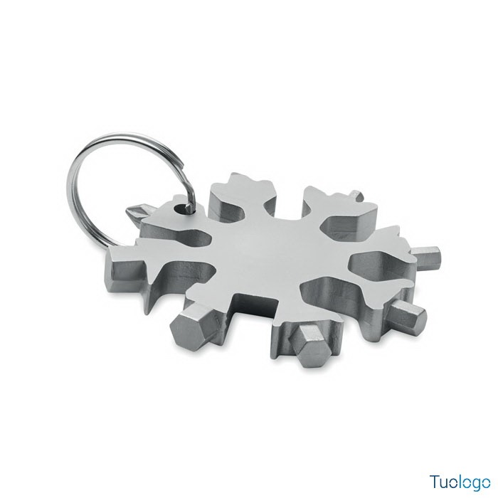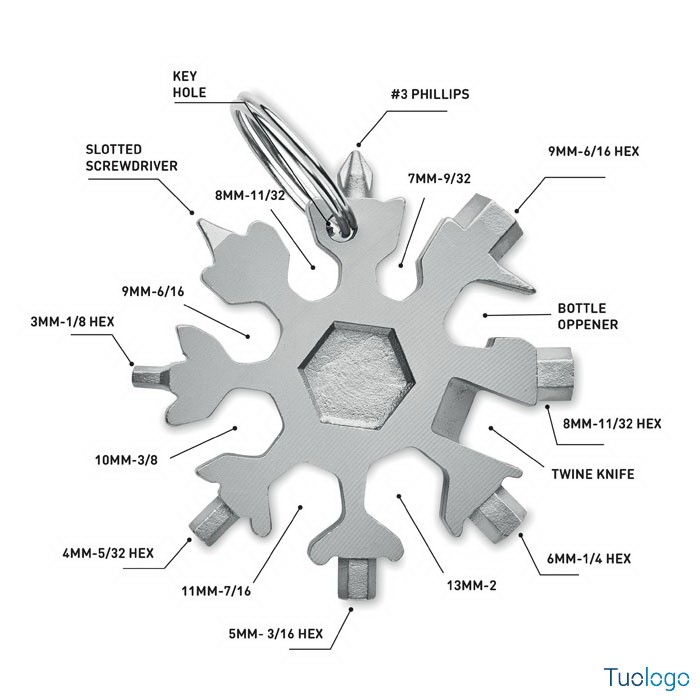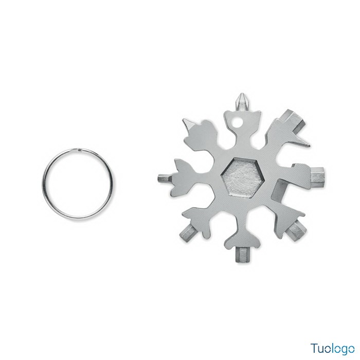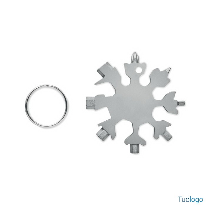 Accessorio multiuso Badagno. Multiattrezzo 17 in 1 in acciaio inosddiabile a forma di fiocco di neve. Con anello portachiavi di metallo opzionale incluso. Dimensioni: cm 6,3x6,3x0,7.