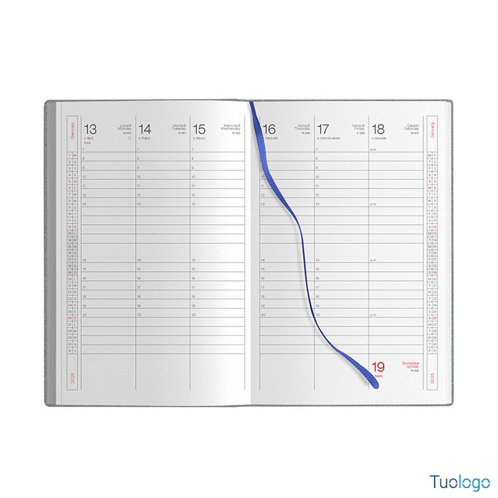 Agenda flessibile sett 14x21. Termovirante, 224 pagine carta bianca, planning mensile, pagine appunti quadretti, puntini e bianche. Il prezzo include la stampa a un colore. Dimensioni: cm 14x21. Edizione multilingue, turnario lavoro, rubrica telefonica, inserti informativi, elastico in tinta. Astuccio disponibile su richiesta. Imballo da 50.