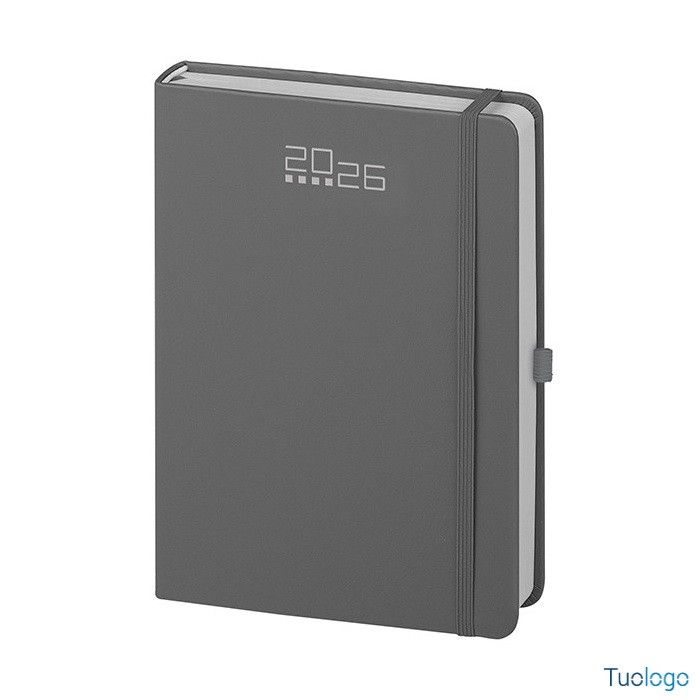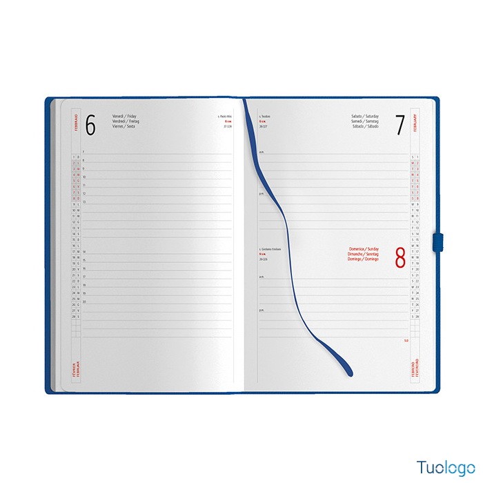 Agenda giornaliera 15x21. 324 pagine carta bianca, sab. e dom. abbinati, chiusura con elastico e portapenne (penna non inclusa). Astuccio. Il prezzo include la stampa a un colore. Dimensioni: cm 15x21. Rubrica telefonica, segnapagine, edizione multilingue. Imballo da 20.
