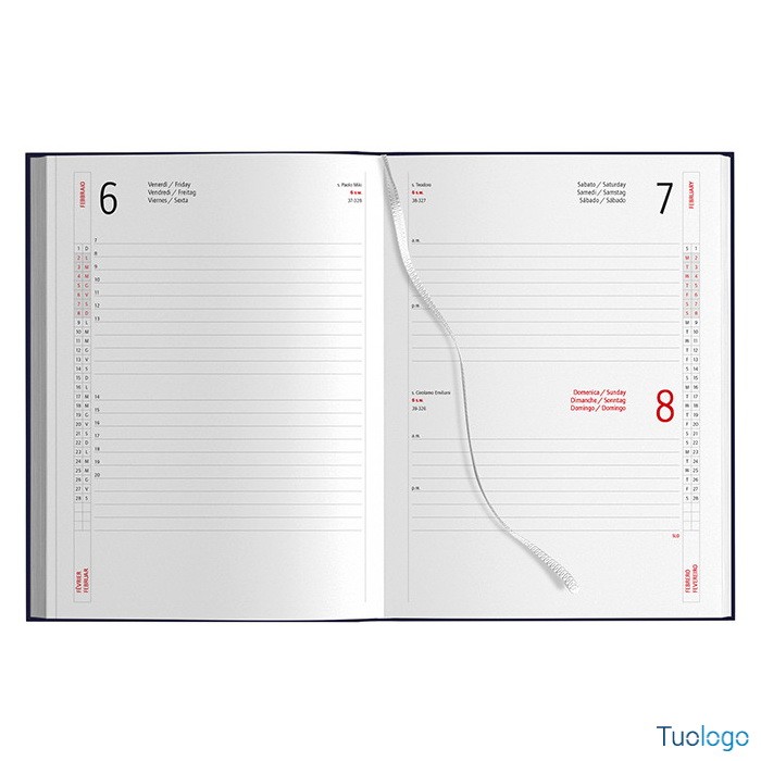 Agenda giornaliera gommata 15x21. 324 pagine carta bianca, sab e dom abbinati, angolo segnapagina perforato, edizione multilingue. Il prezzo include la stampa a un colore. Dimensioni: cm 15x21. Quadranti imbottiti, rubrica telefonica, inserto cartografico, segnapagine. Astuccio disponibile su richiesta. Imballo da 20.