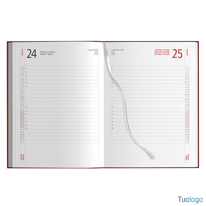 Agenda giornaliera gommata 15x21. 404 pagine carta bianca, sabato e domenica separati, edizione multilingue. Il prezzo include la stampa a un colore. Dimensioni: cm 15x21. Rubrica telefonica, quadranti imbottiti, inserto cartografico, segnapagina. Astuccio disponibile su richiesta. Imballo da 20.