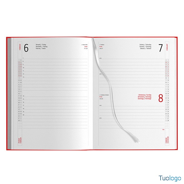 Agenda giornaliera gommata 17x24. 324 pagine carta bianca, sabato e domenica abbinati, inserto cartografico, segnapagine, edizione multilingue. Il prezzo include la stampa a un colore. Dimensioni: cm 17x24. Rubrica telefonica, quadranti imbottiti. Astuccio disponibile su richiesta. Imballo da 20.