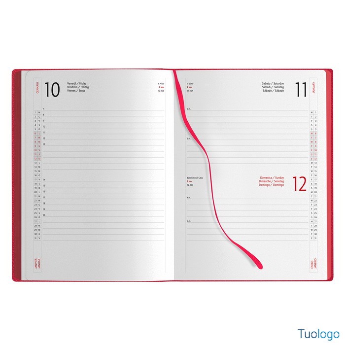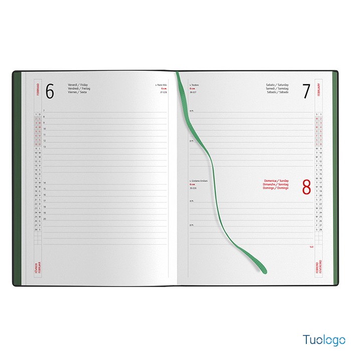 Agenda giornaliera termovirante 15x21. 324 pagine carta bianca stampa a 2 colori, inserti informativi e rubrica telefonica, segnapagine. Il prezzo include la stampa ad un colore. Dimensioni: cm 15x21. Quadranti angoli tondi, inserto cartografico, chiusura con elastico. Astuccio disponibile su richiesta. Imballo da 20.