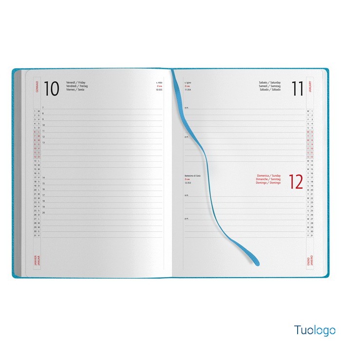 Agenda giornaliera termovirante 15x21. 324 pagine carta bianca, edizione multilingue, inserti informativi e rubrica telefonica, segnapagine. Astuccio. Il prezzo include la stampa ad un colore. Dimensioni: cm 15x21. Quadranti angoli tondi, inserto cartografico, chiusura con elastico. Imballo da 20.