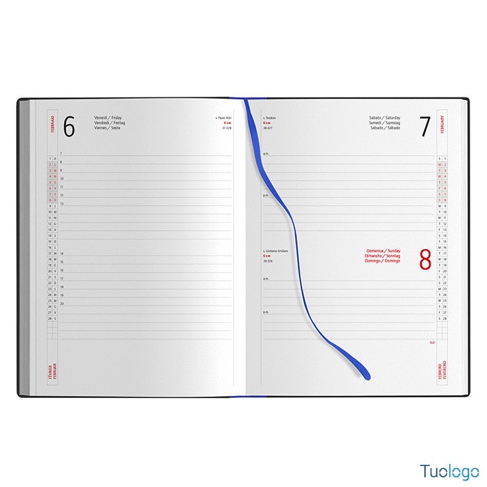 Agenda giornaliera termovirante 17x24. 324 pagine carta bianca, sabato e domenica abbinati, segnapagine, ediz. multilingue. Prezzo include la stampa in tampografia ad un colore. Dimensioni: cm 17x24. Astuccio disponibile su richiesta. Rubrica telefonica, inserto cartografico. Imballo da 20.