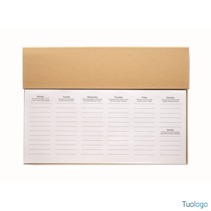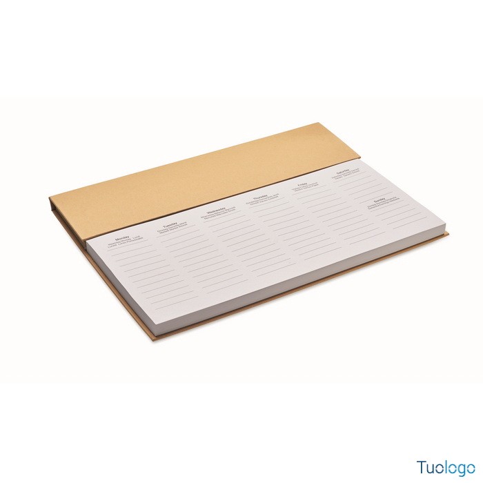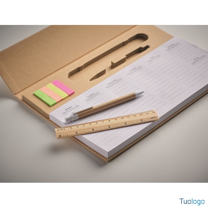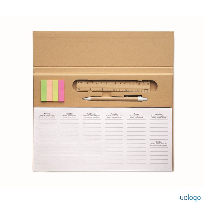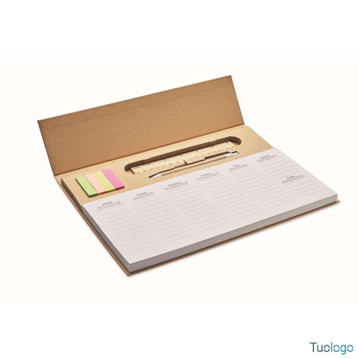 Agenda Memk. Agenda settimanale da tavolo con copertina in carta kraft, penna a scatto in cartone, righello in legno e blocco note adesivo. Inchiostro blu. Dimensioni: cm 30.X1.6X21.4.