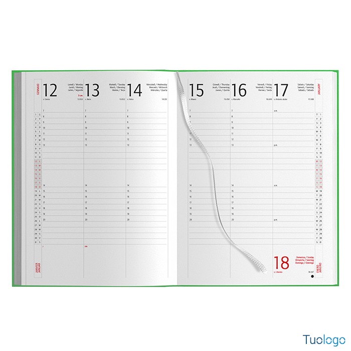 Agenda settimanale gommata 17x24. 132 pagine bianche, segnapagine, edizione multilingue, rubrica telefonica, quadranti imbottiti, inserto cartografico. Il prezzo include la stampa a un colore. Dimensioni: cm 17x24. Astuccio disponibile su richiesta. Imballo da 30.