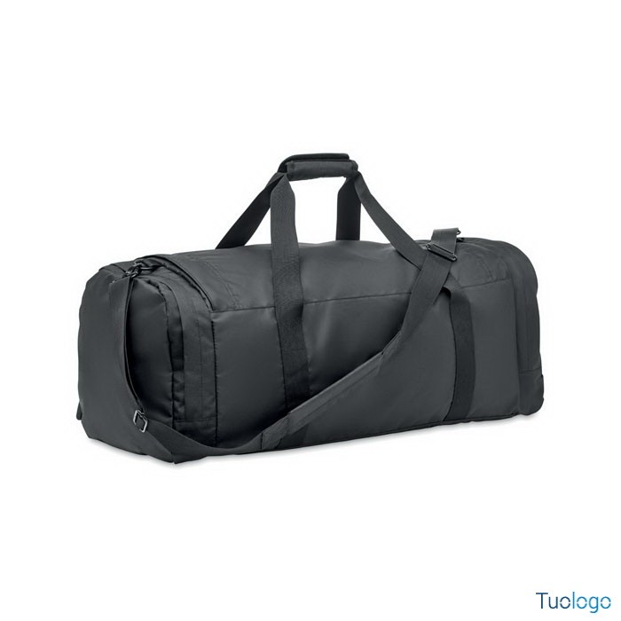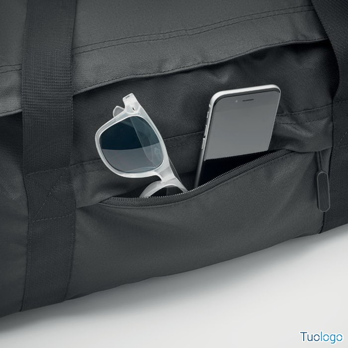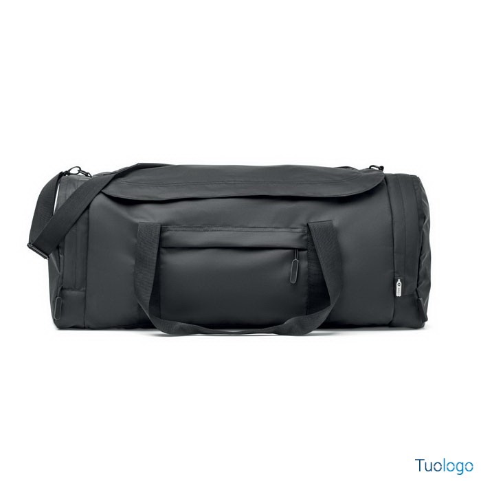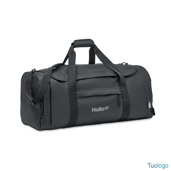 Ampia borsa sport viaggio. In poliestere 300D RPET.Scomparto principale con cerniera laterale, scomparti porta oggetti. Tracolla e parte inferiore di rinforzo rimovibile.Dimensioni: cm 63x29x27.