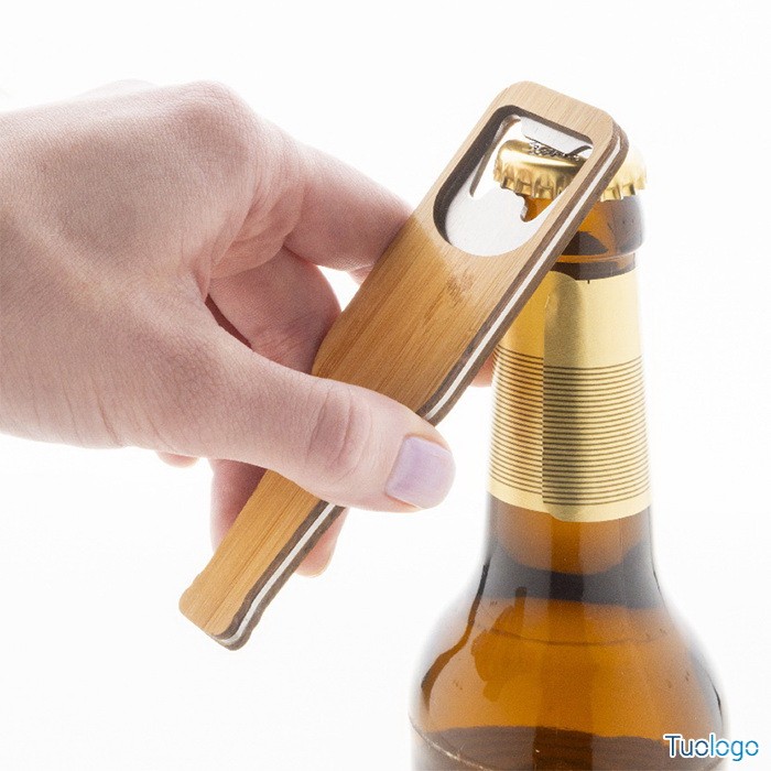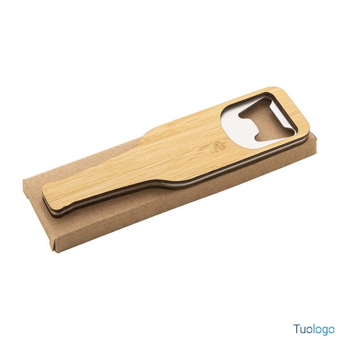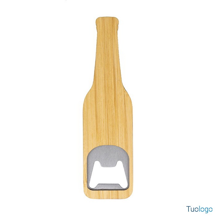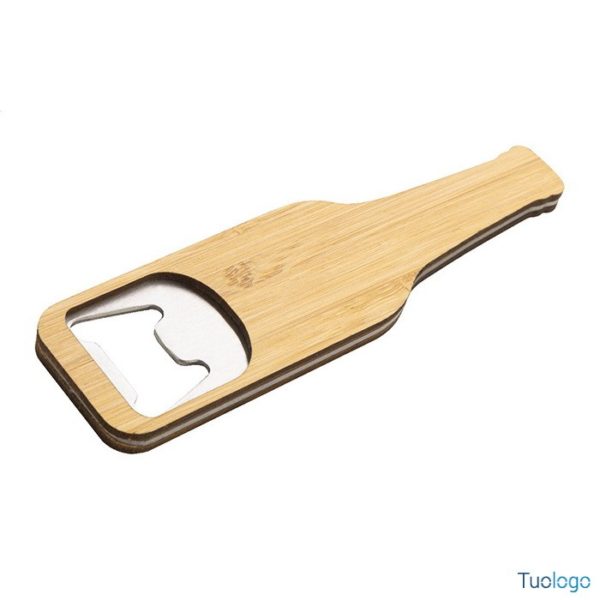Apribottiglie Monroy. Apribottiglie in acciaio a forma di bottiglia con superficie in bamboo. Dimensioni: cm 12x3,3x0,6.