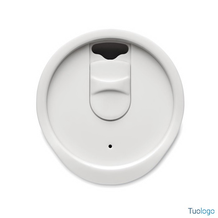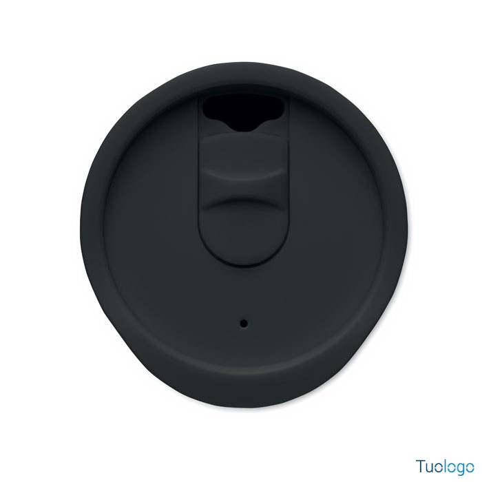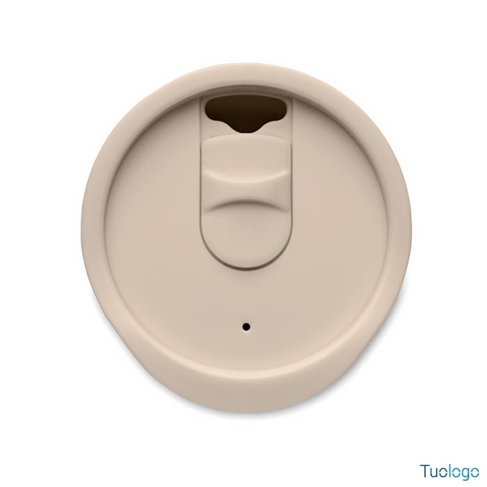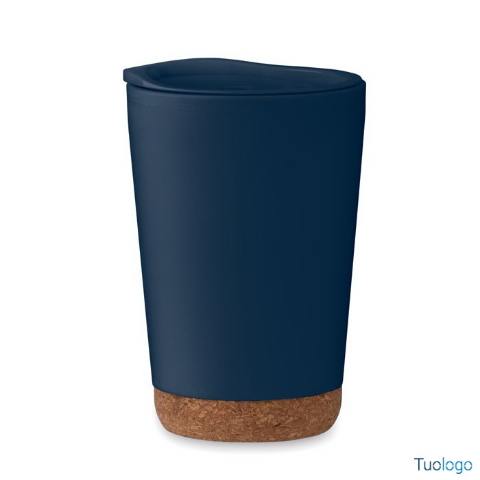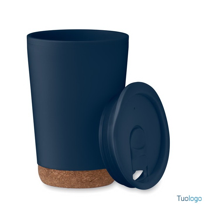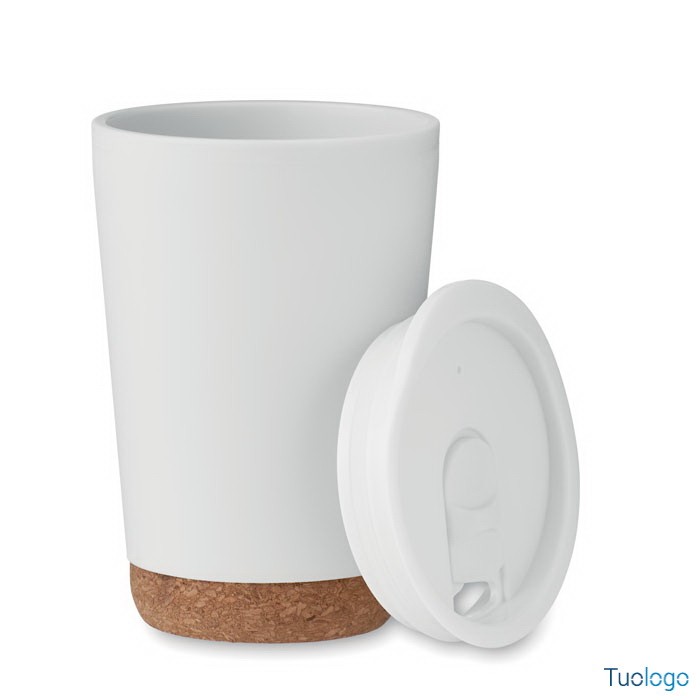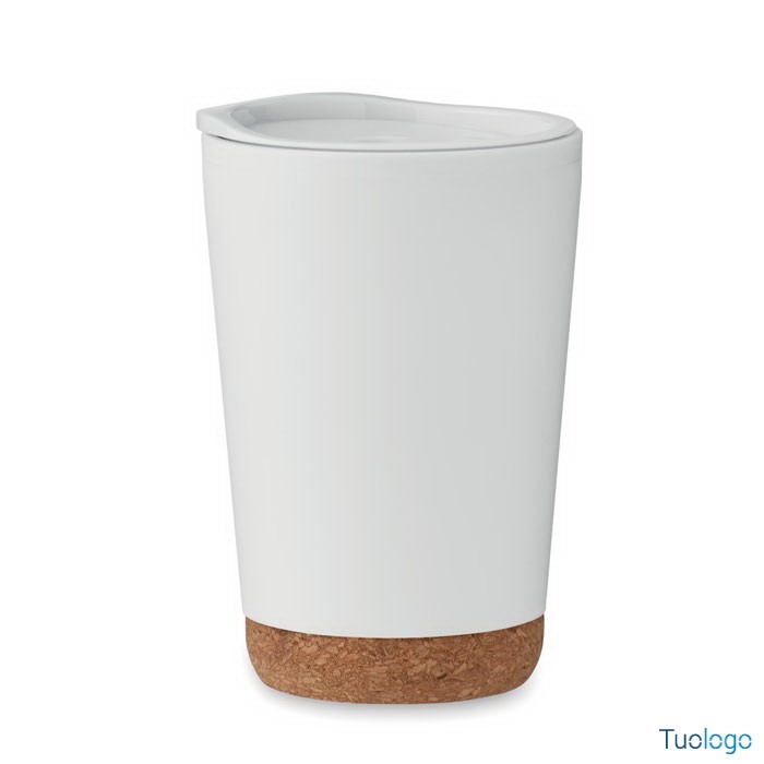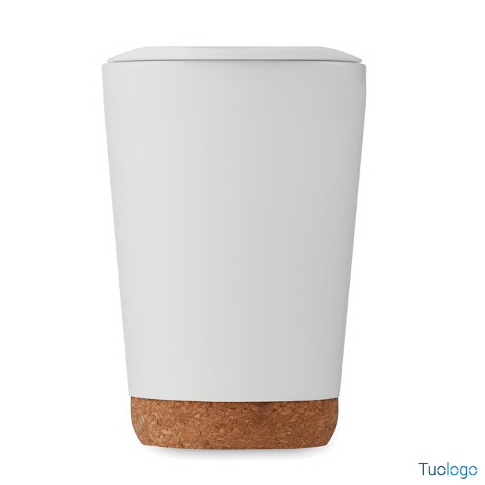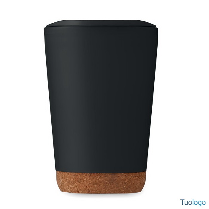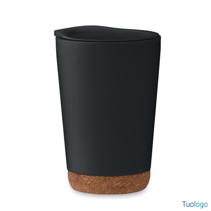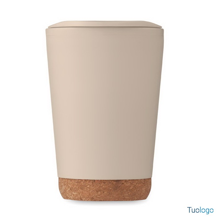 Bicchiere con chiusura a scorrimento Bonito. Bicchiere a doppio strato e in PP con base in sughero e coperchio con chiusura a scorrimento in PS e ABS. Capacità: 300 ml. Dimensioni: cm 8x12.