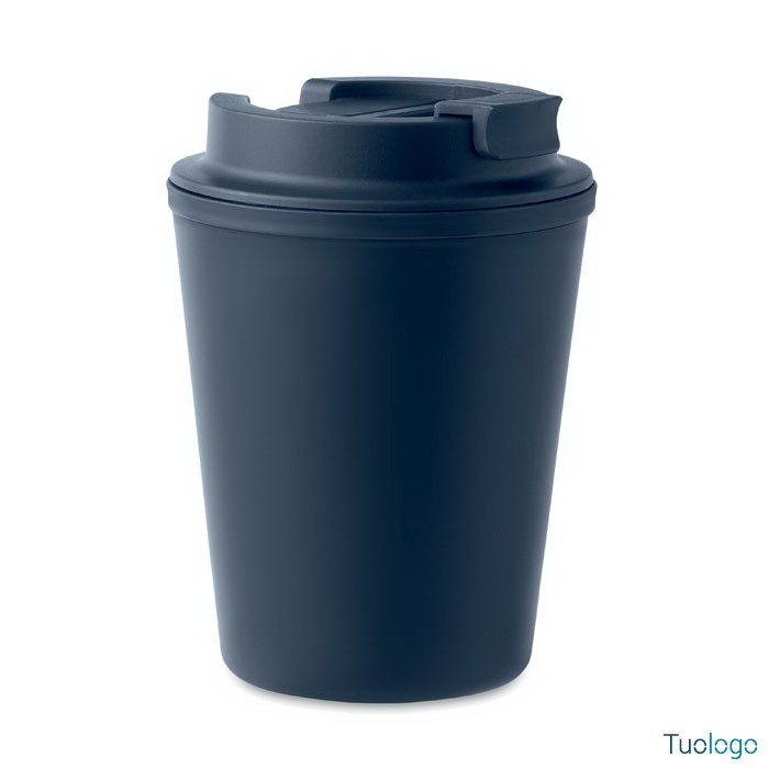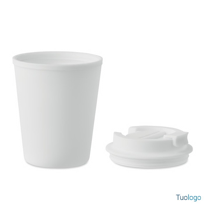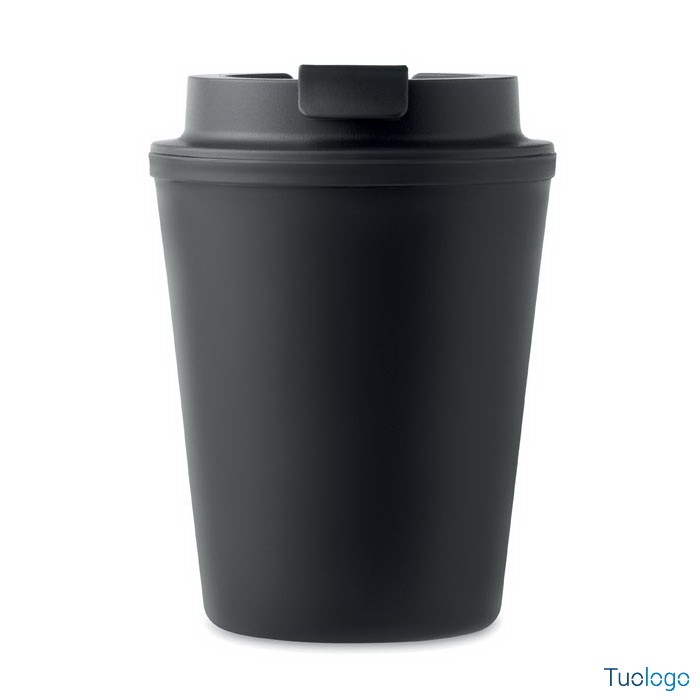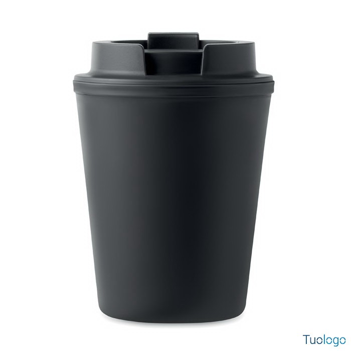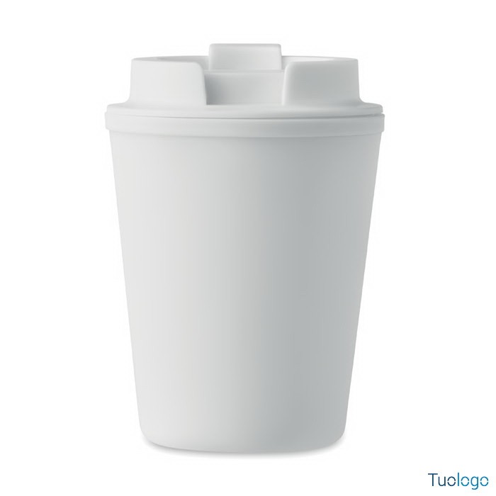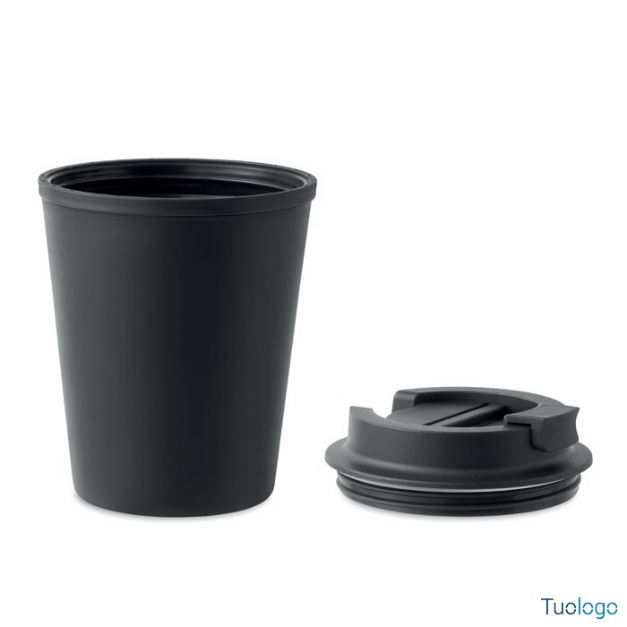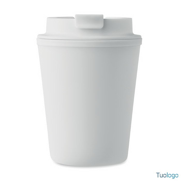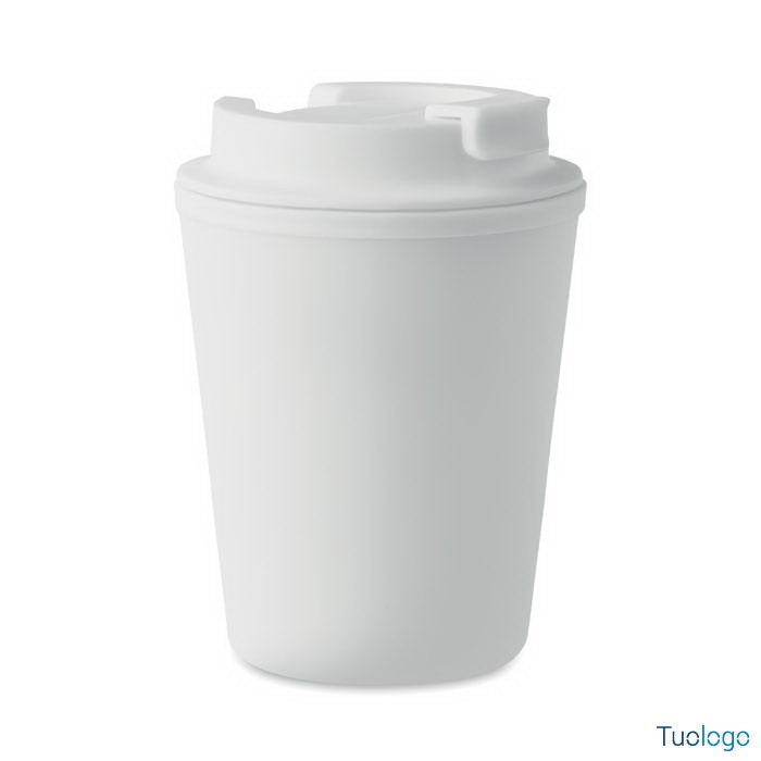 Bicchiere con coperchio Anjos. Bicchiere doppio strato con coperchio con cannuccia in PP riciclato. Capacità: 300 ml. Dimensioni: diam cm 9x12.