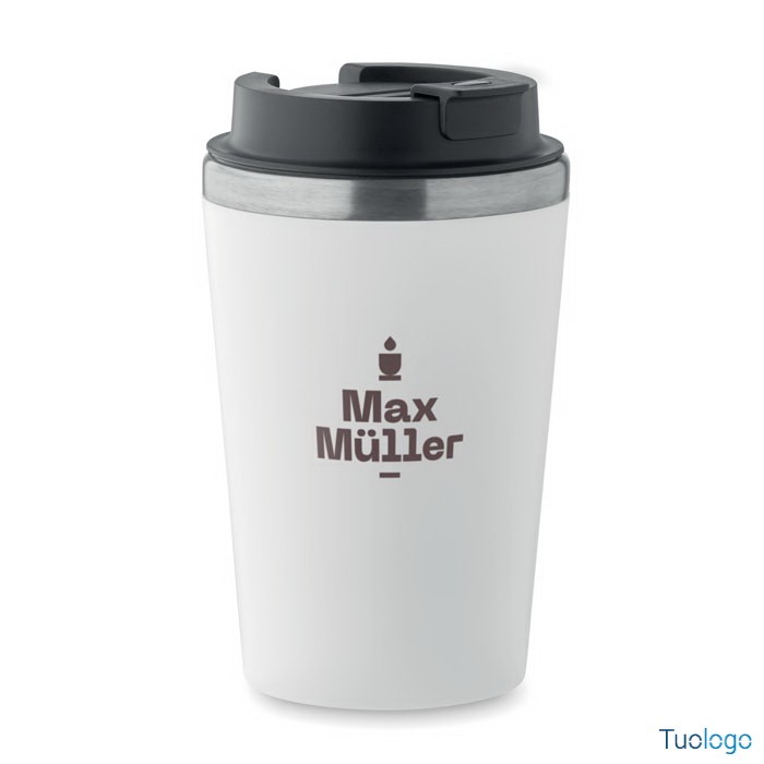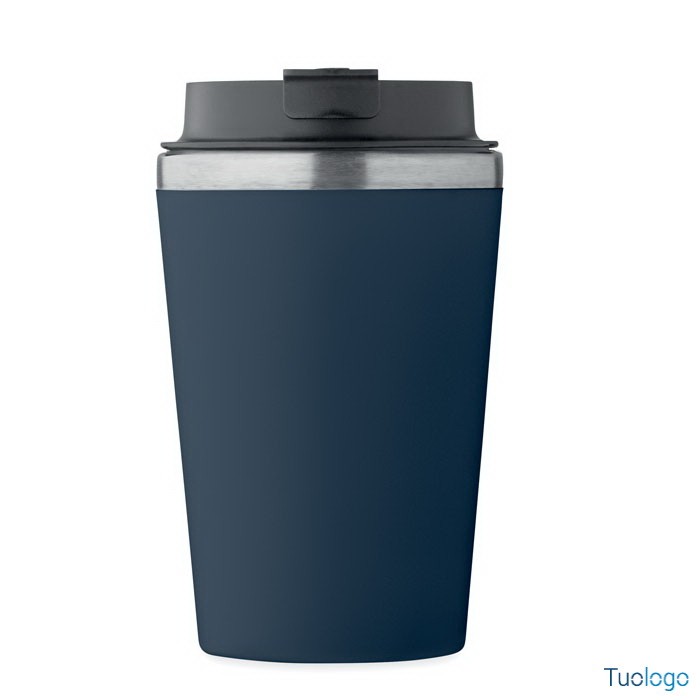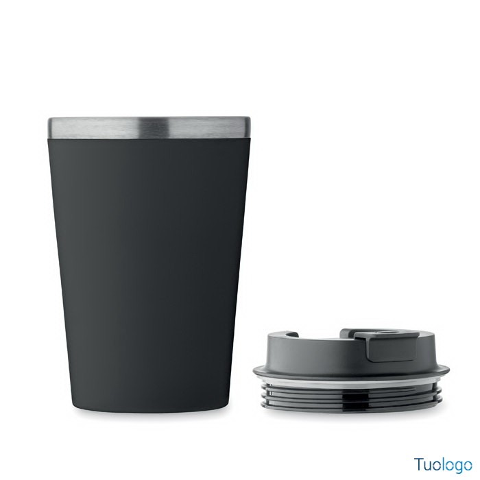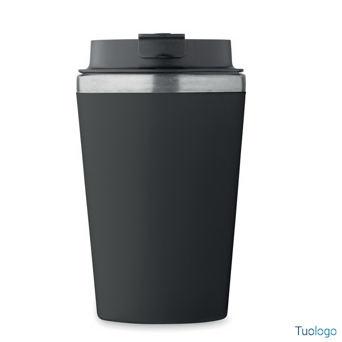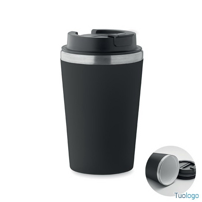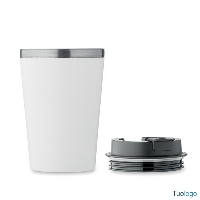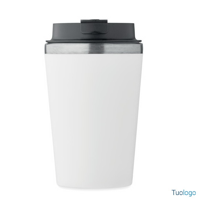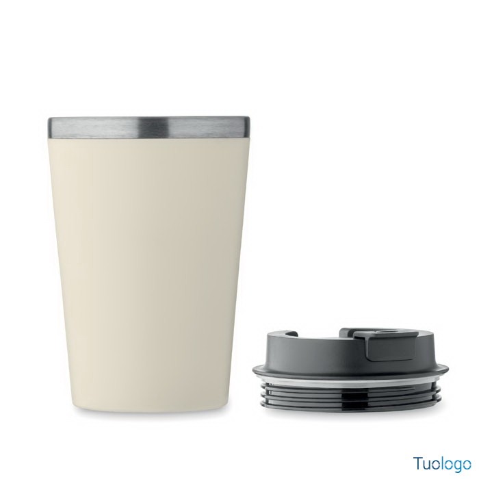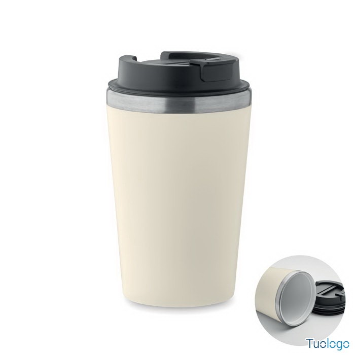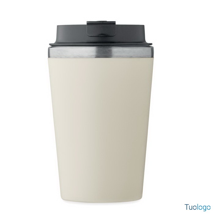 Bicchiere con rivestimento in ceramica Parash. Bicchiere a doppio strato in PP con parete interna in acciaio inox riciclato (90% acciaio inox riciclato e 10% acciaio inox) e rivestimento interno in ceramica. Senza perdite.Dimensioni: cm 8.5x14.