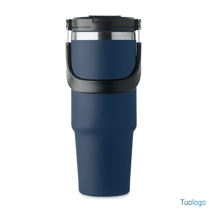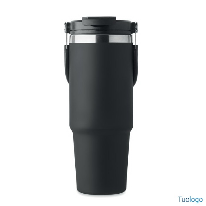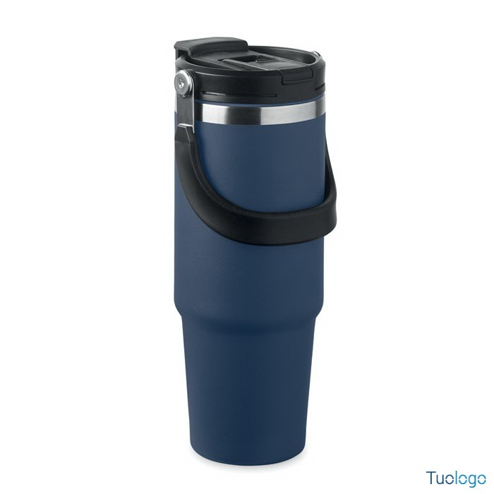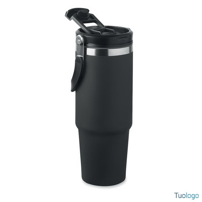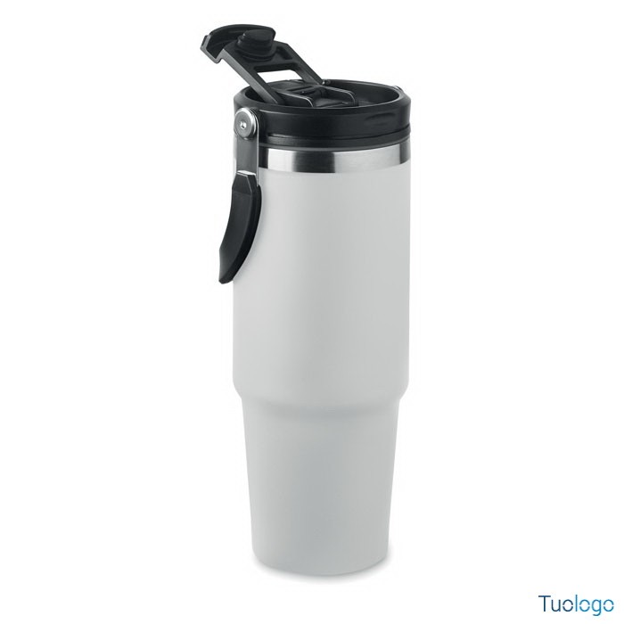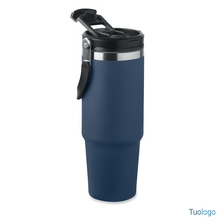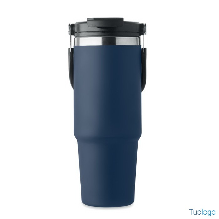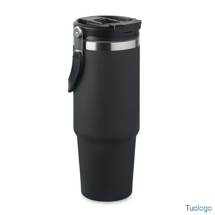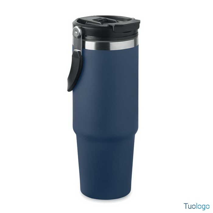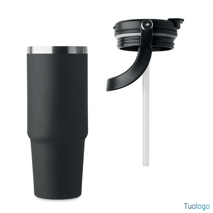 Bicchiere in acciaio riciclato Tenere. Bicchiere a doppio strato in acciaio inox riciclato con coperchio con cannuccia interna, imboccatura pieghevole e apertura per bere direttamente. Capacità 850 ml.Dimensioni: cm 33x25.5x20.