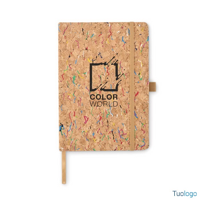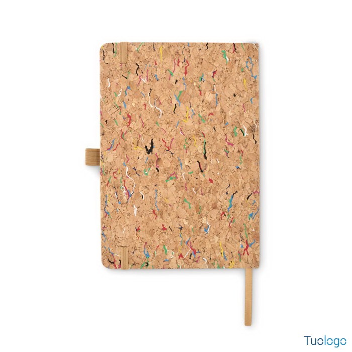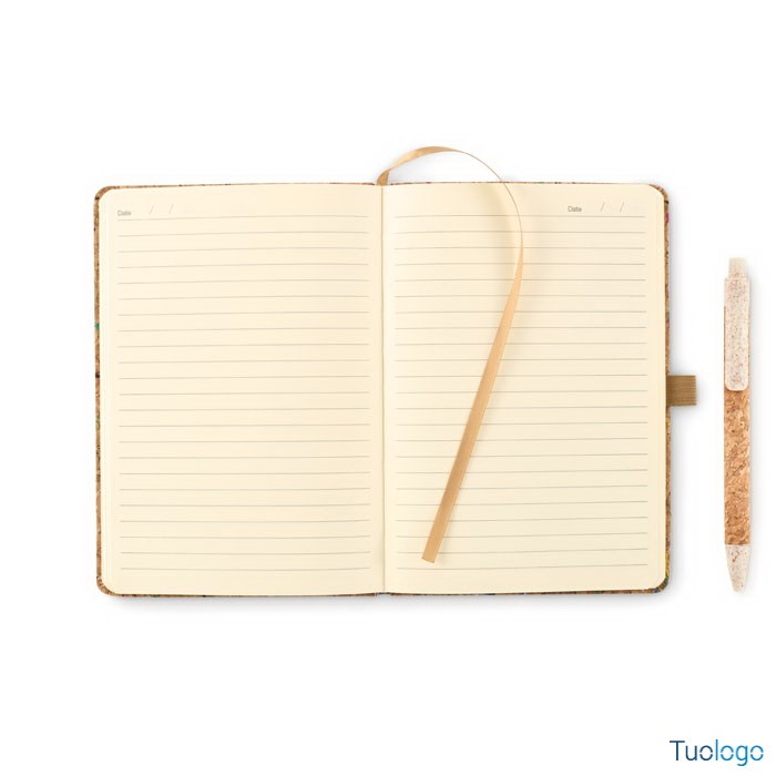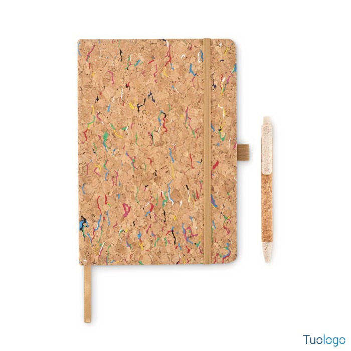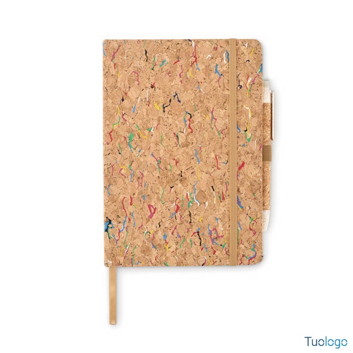Bloc notes A5 in sughero con penna. Copertina rigida in sughero colorato. Rilegato con custodia. 96 fogli a righe. Cinturino di chiusura elastico, segnalibro a nastro e portapenne. Inchiostro blu. Dimensioni: cm 16x1,4x21.