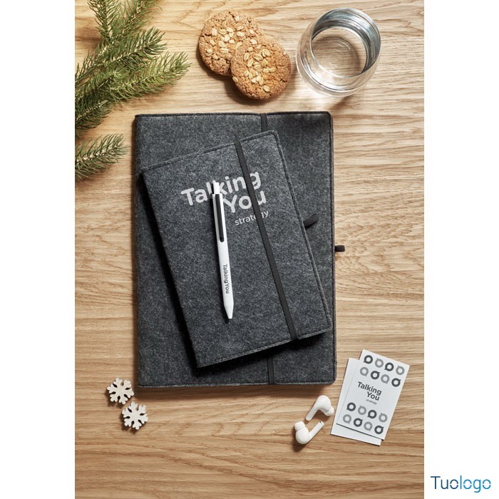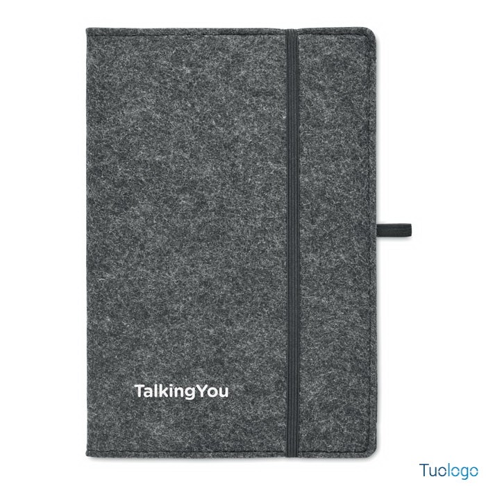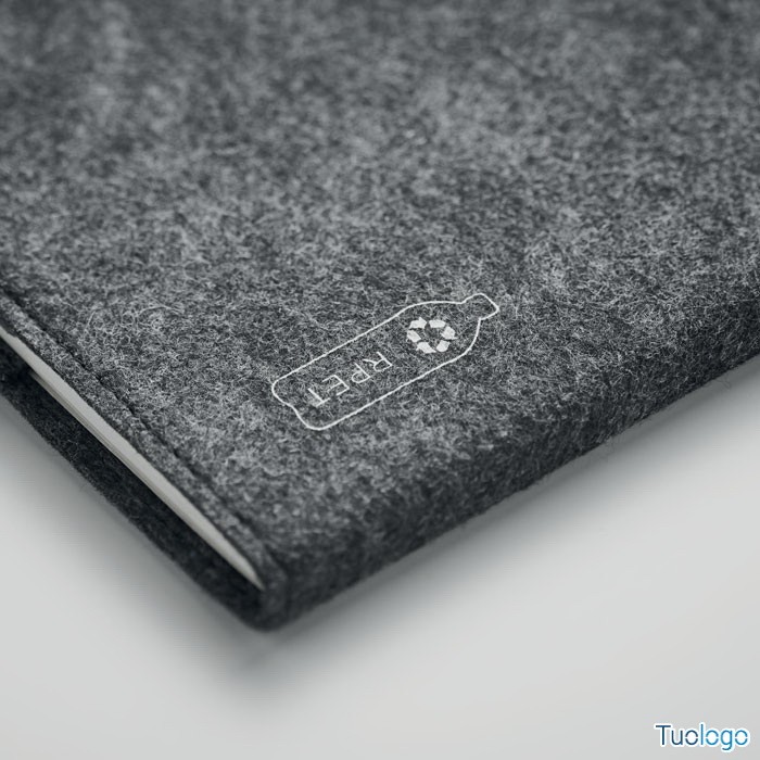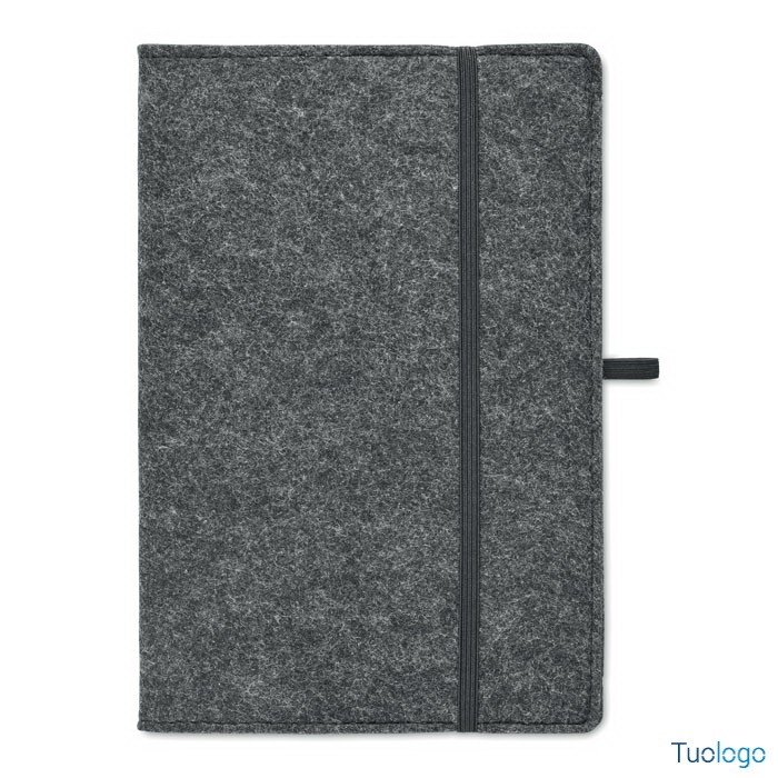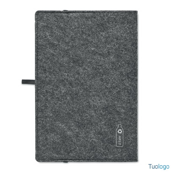 Bloc notes A5 Rpet. In feltro RPET, 80 fogli a righe in carta riciclata formato A5, con portapenne ed elastico. Dimensioni: cm 15x22x1,6.