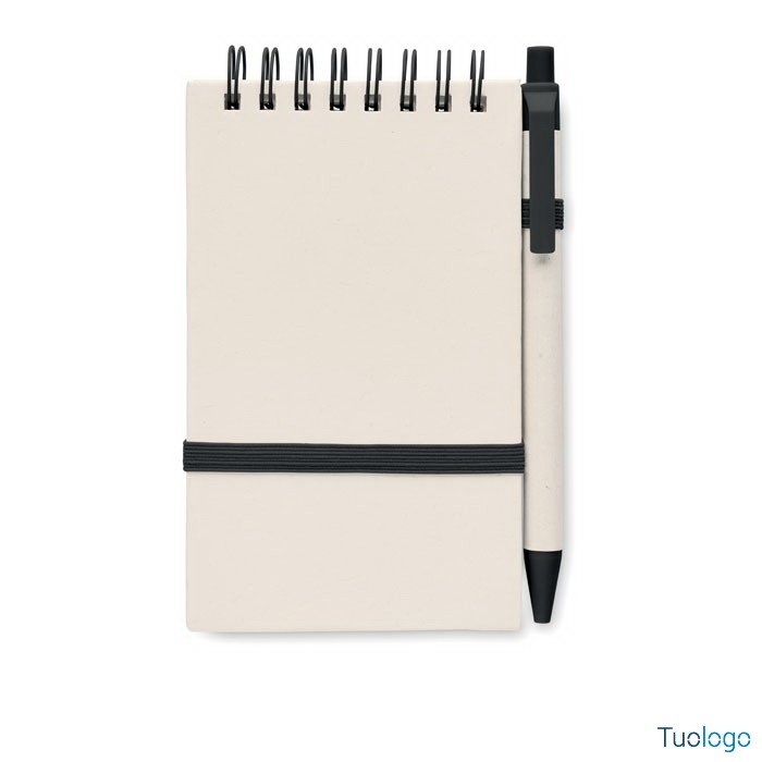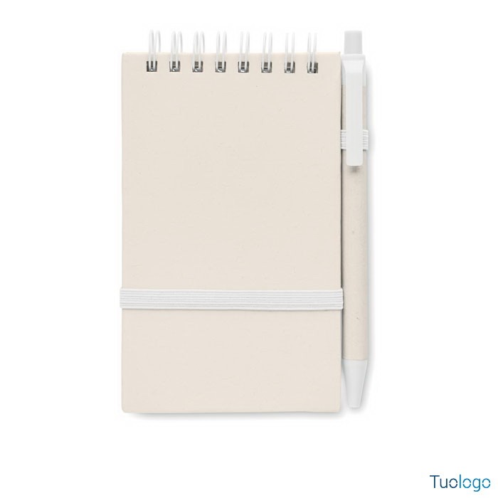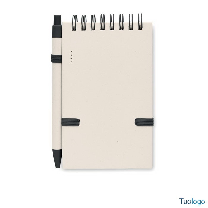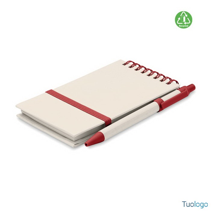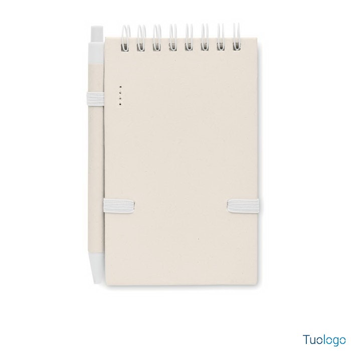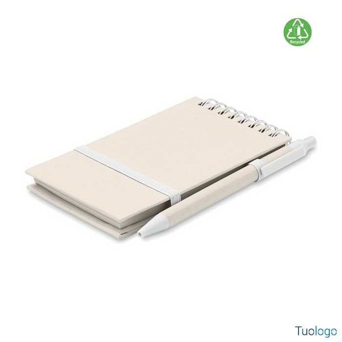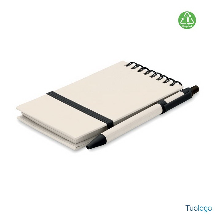 Bloc notes riciclato Padulle. Bloc notes da 70 fogli A6 in carta composta da 70% cartone del latte riciclato e 30% carta riciclata con penna abbinata. Dimensioni: cm 8,2x1,2x14.