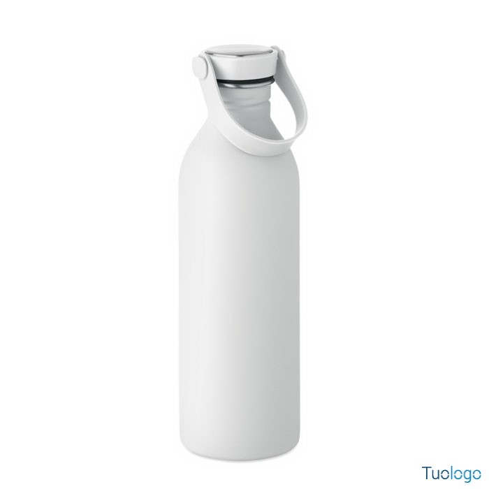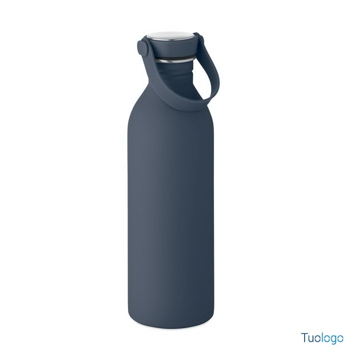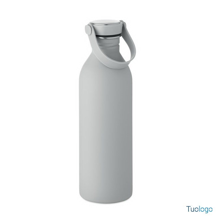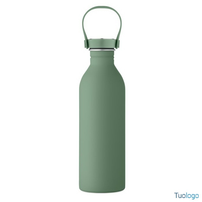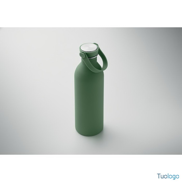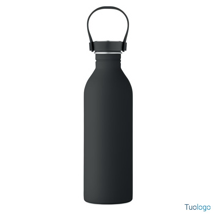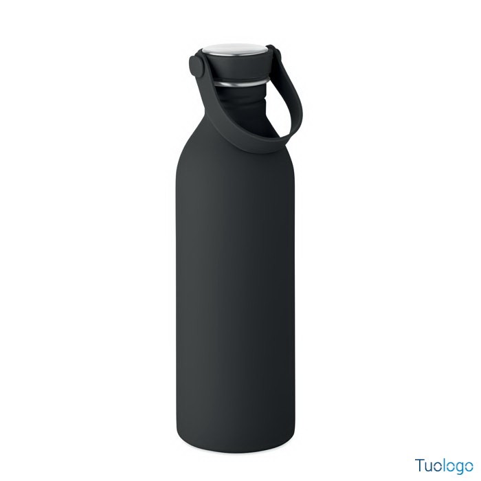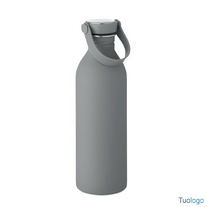 Borraccia 500ml Simbo. Bottiglia a singolo strato in acciaio inox riciclato,finitura in gomma. Coperchio in PP e SS, manico in silicone. 500 ml. Dimensioni: cm 6.1x21.3. Attenzione al surriscaldamento.