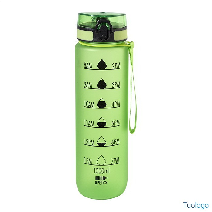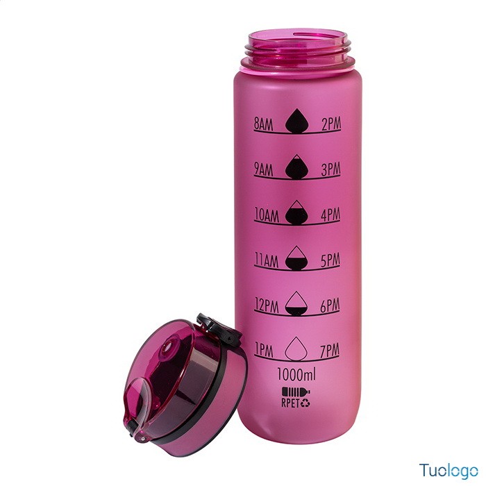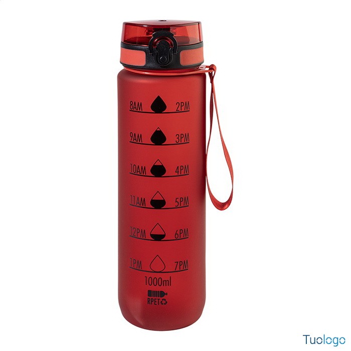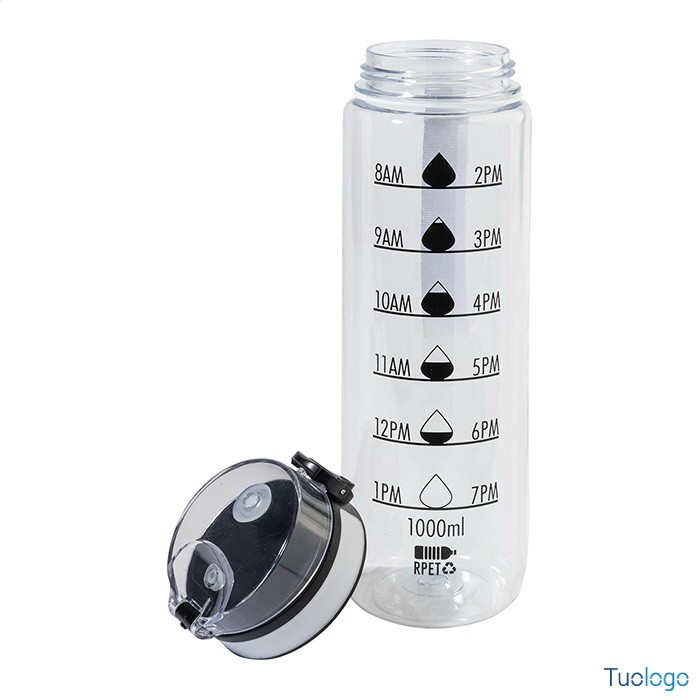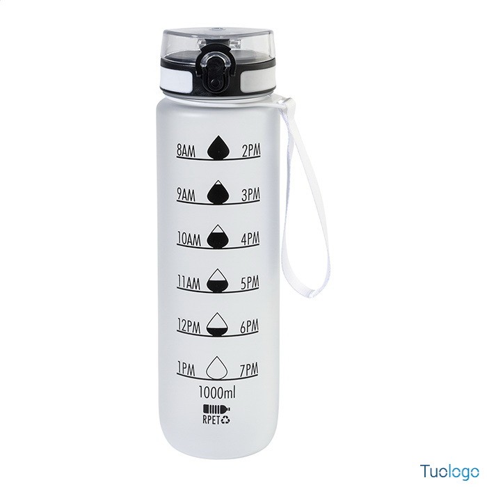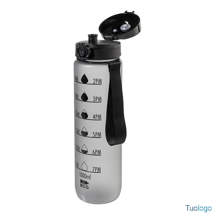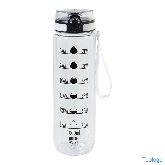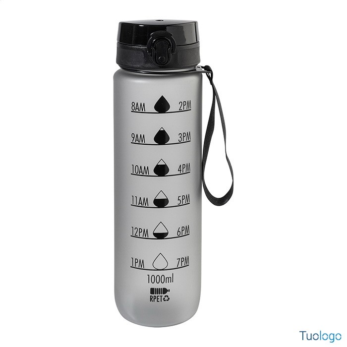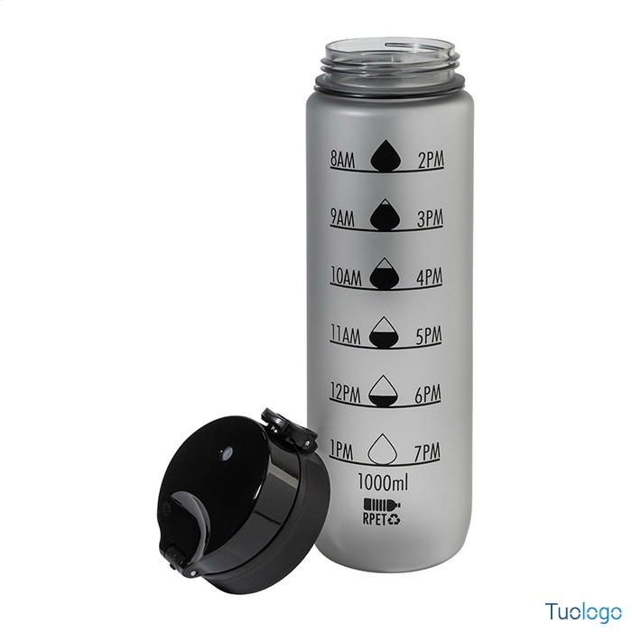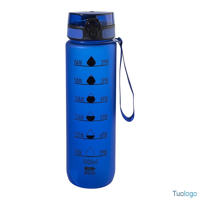 Borraccia RPET 1000ml Fornells. Borraccia in RPET satinato, senza BPA, da 1000ml. Con indicazioni motivazionali relative all acqua ed all orario in cui assumerla. Dimensioni: diam cm 7,2x28. dotata di tappo flip-top ad apertura automatica con chiusura di sicurezza e tracolla. Non adatta a contenere bevande gassate.