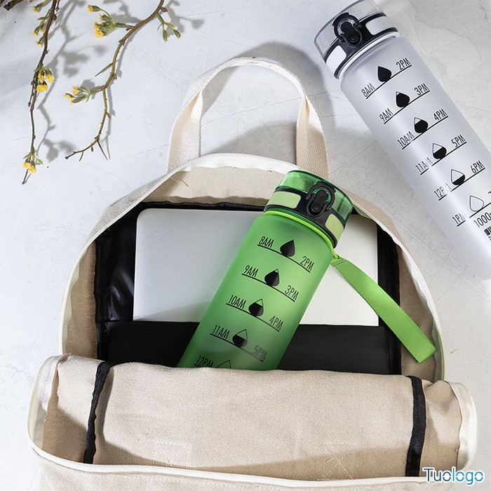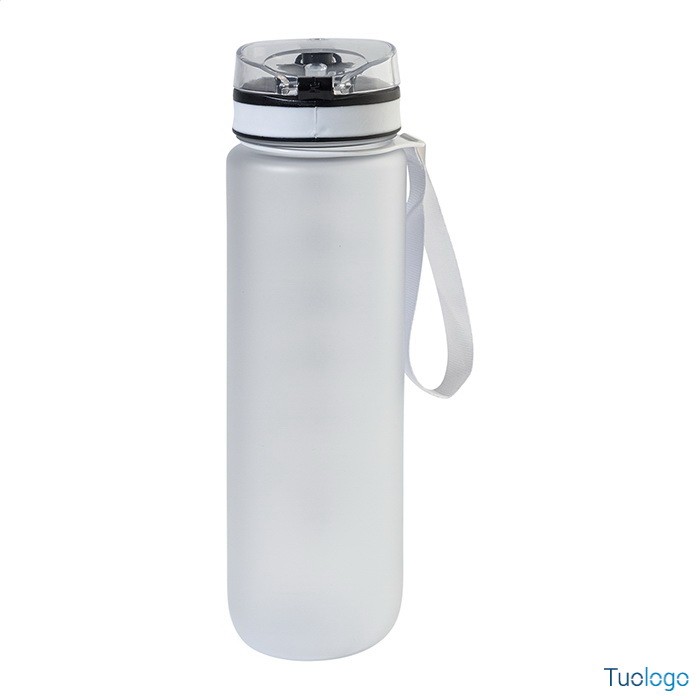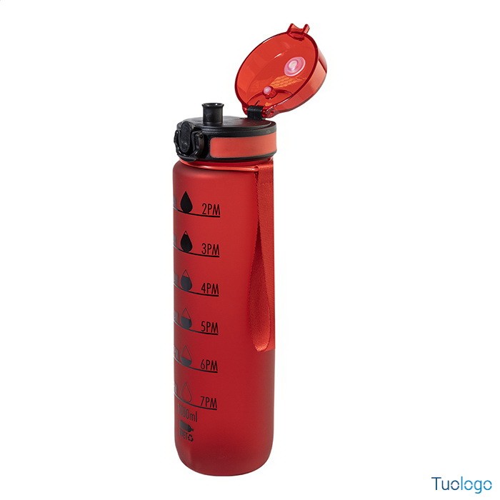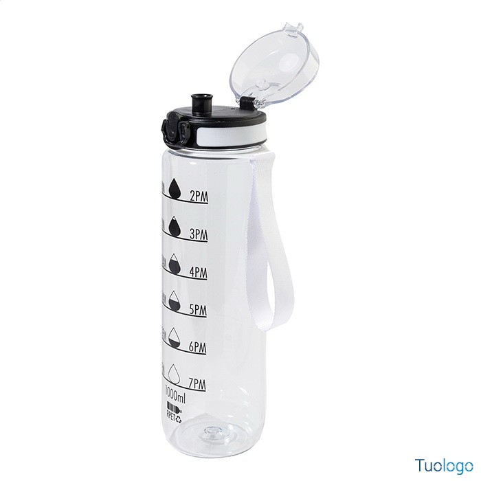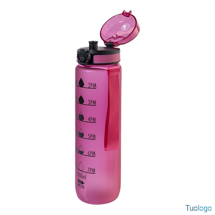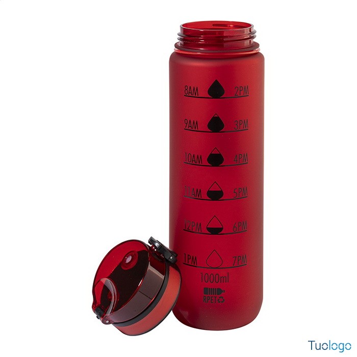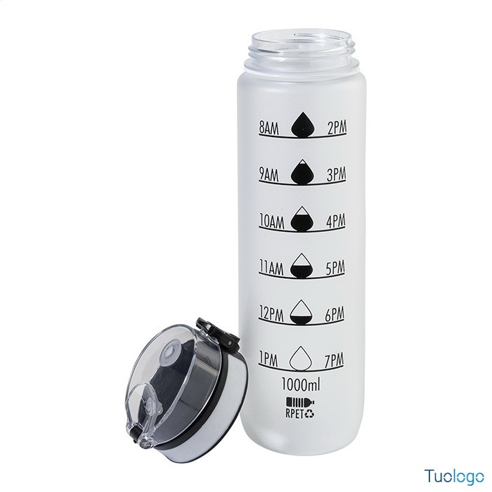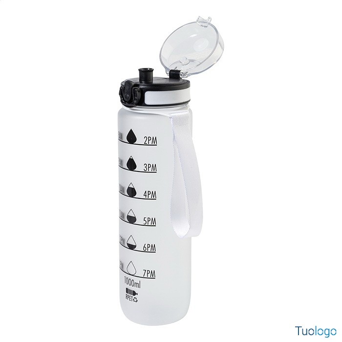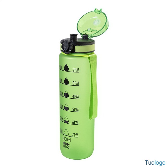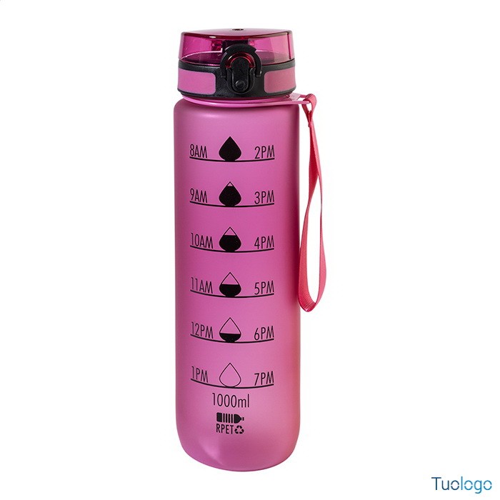 Borraccia RPET 1000ml Fornells. Borraccia in RPET satinato, senza BPA, da 1000ml. Con indicazioni motivazionali relative all acqua ed all orario in cui assumerla. Dimensioni: diam cm 7,2x28. dotata di tappo flip-top ad apertura automatica con chiusura di sicurezza e tracolla. Non adatta a contenere bevande gassate.