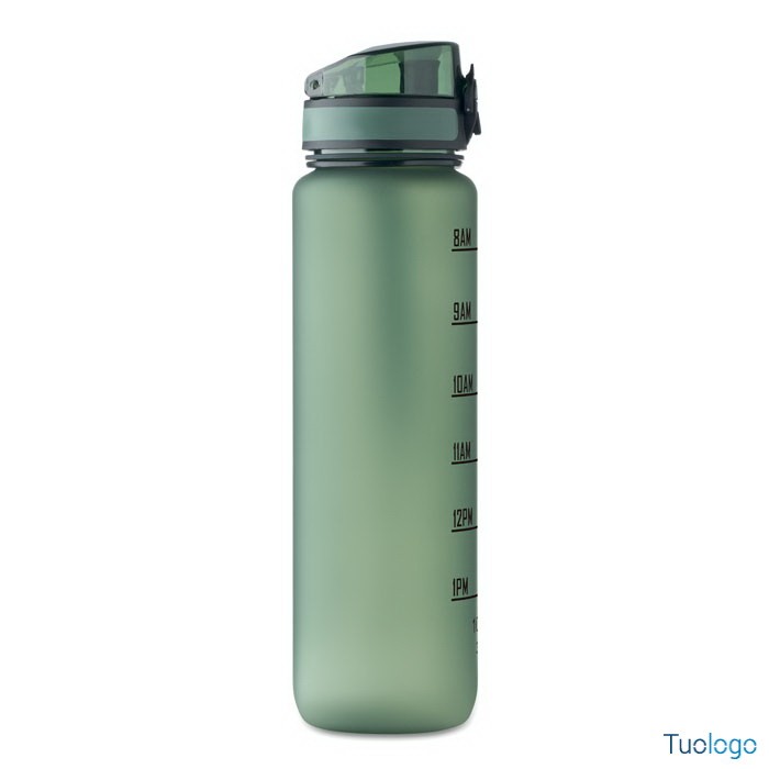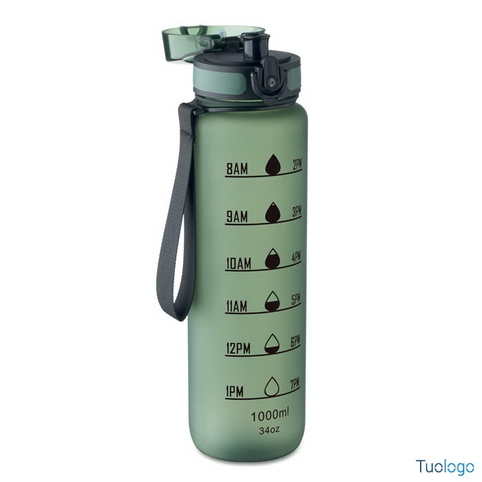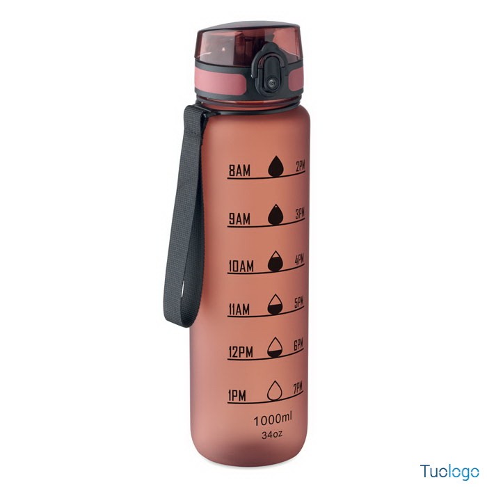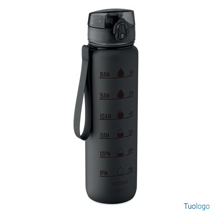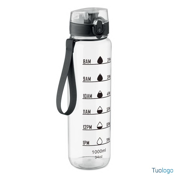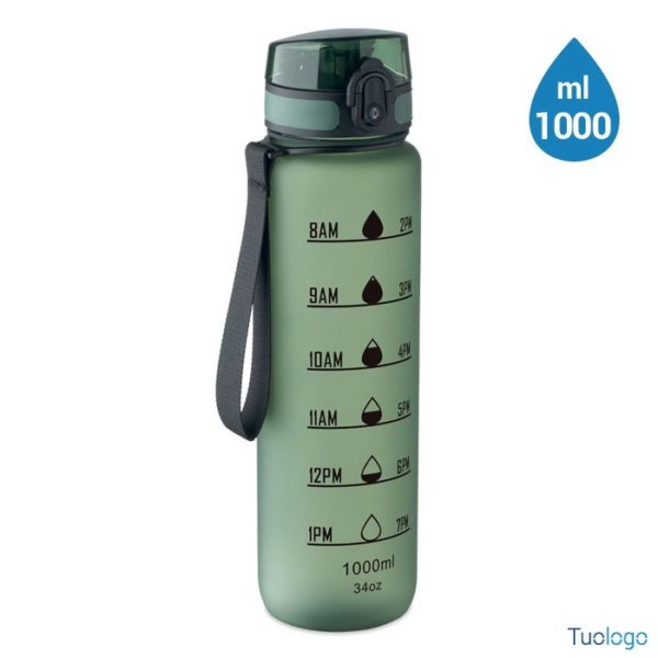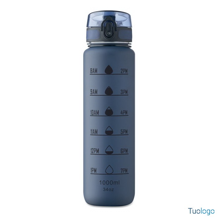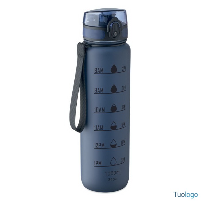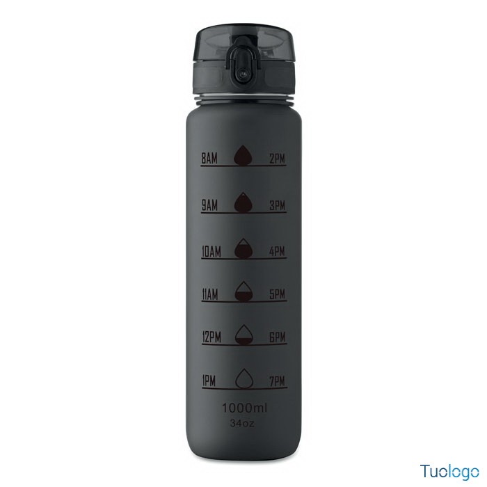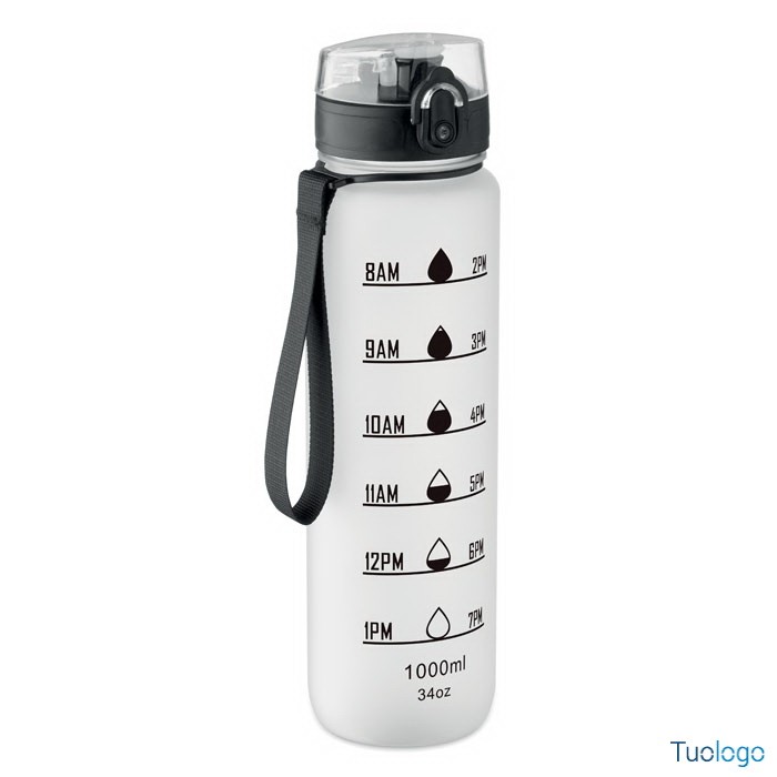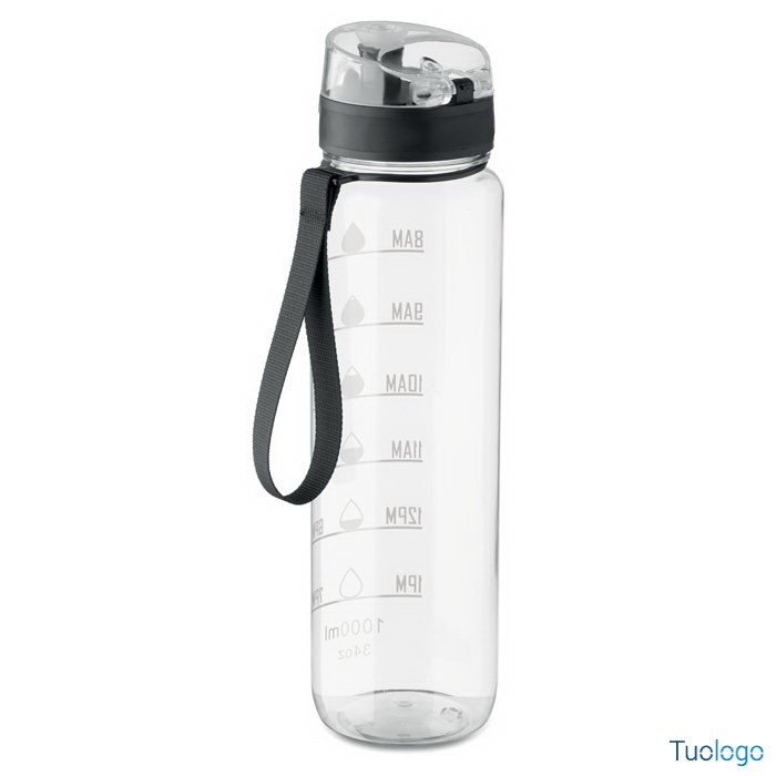 Borraccia sportiva 1L Malax. Borraccia sportiva in RPET, con indicatori di tempo motivazionali, coperchio flip top.Chiusura di sicurezza e cinghia di trasporto. 1L. Dimensioni: 7,5x28,5 cm.
