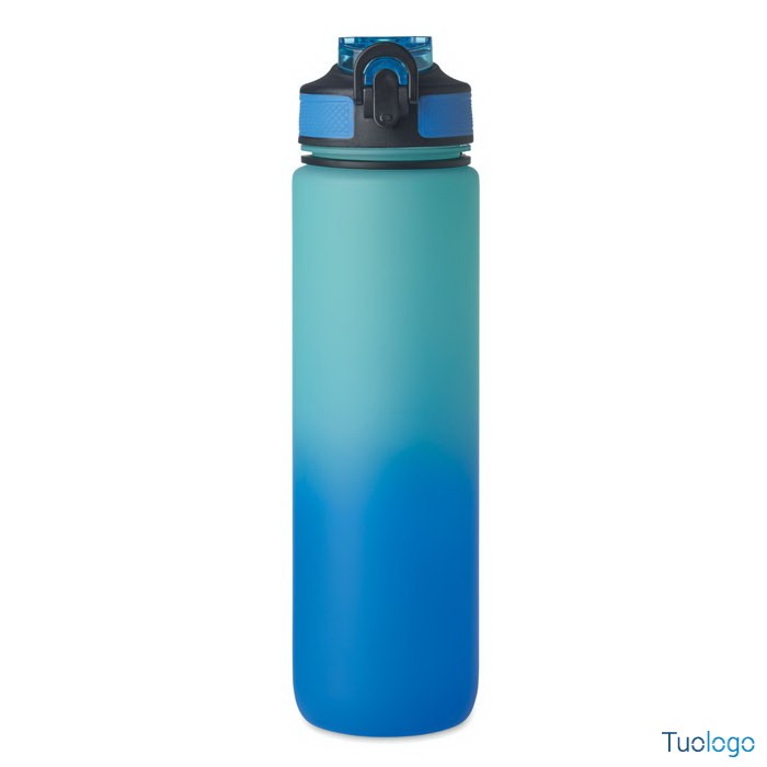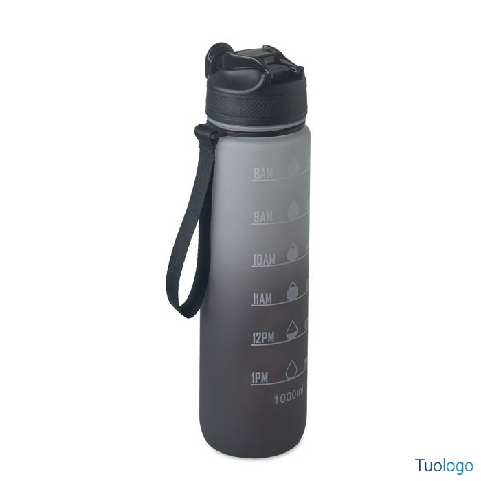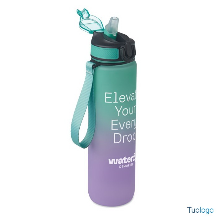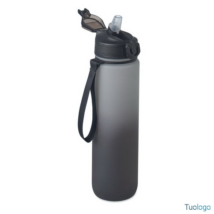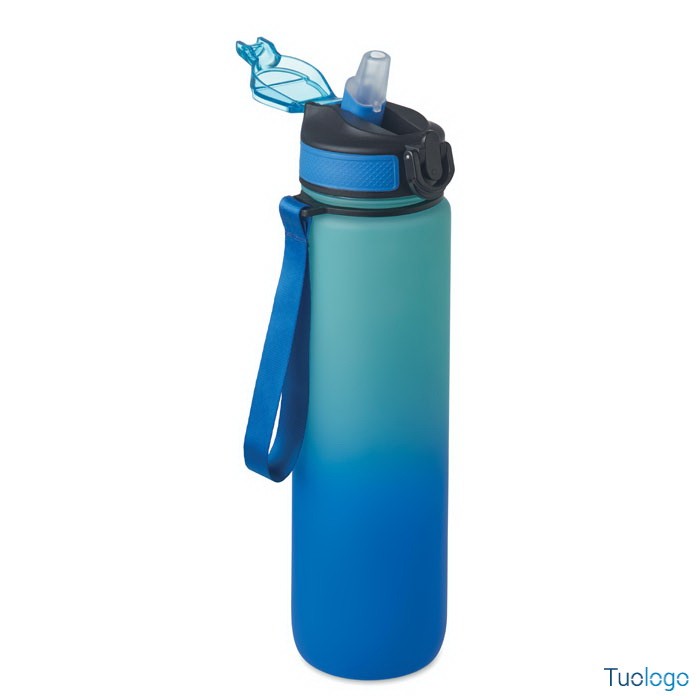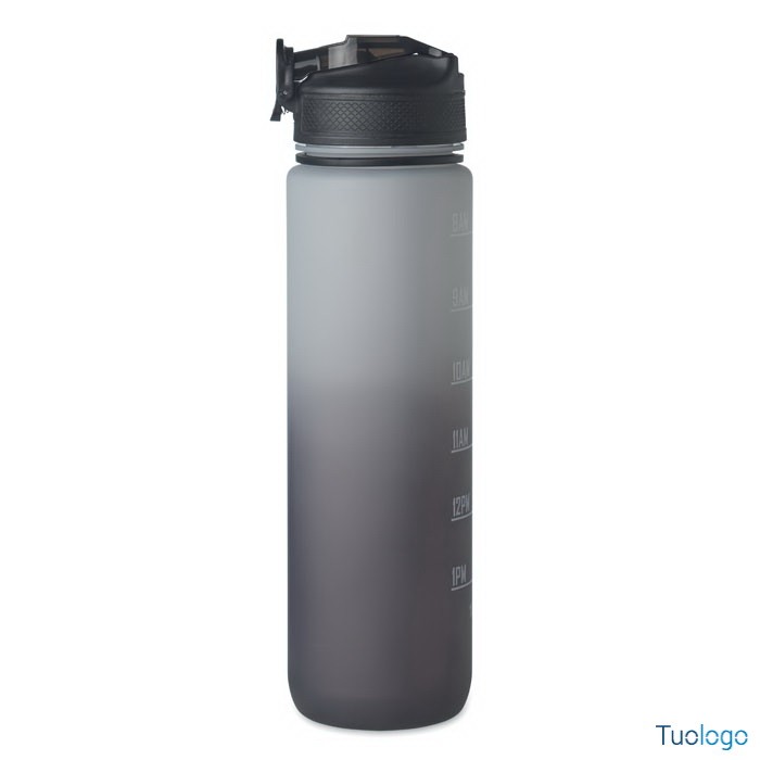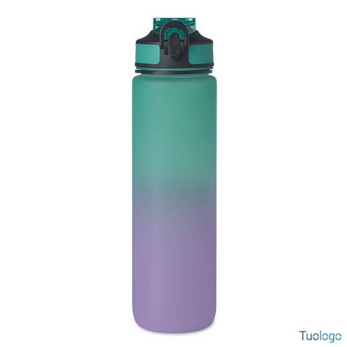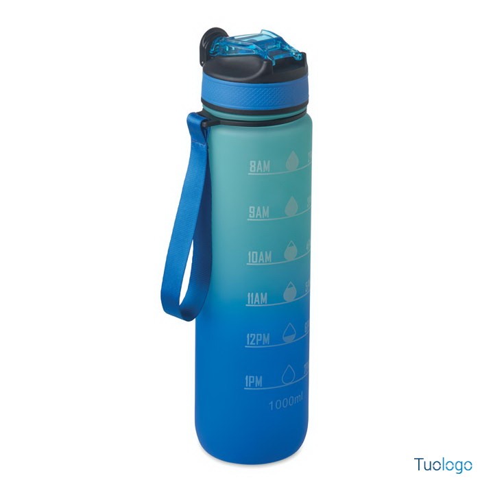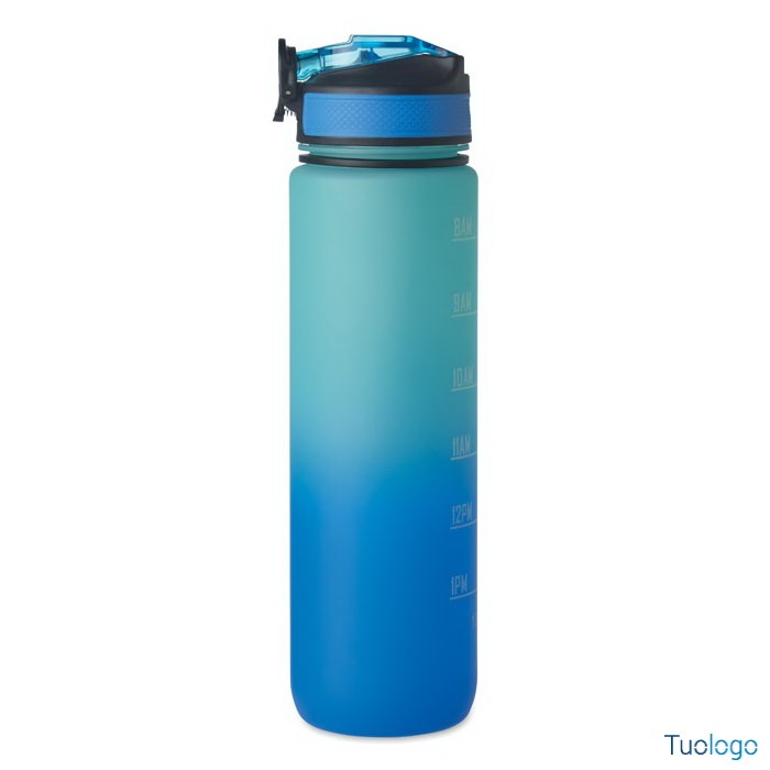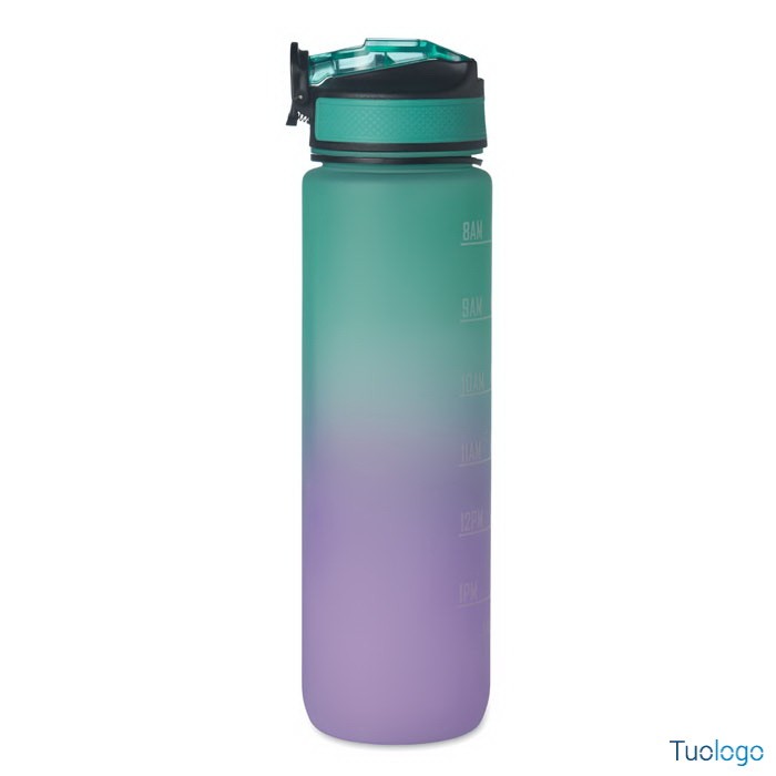 Borraccia sportiva in RPET con cannuccia Queto. Borraccia sportiva in RPET con cannuccia integrata, boccaglio in morbido silicone, indicazione del tempo motivazionale, coperchio flip top apribile con una sola mano. Dimensioni: cm 7x28.