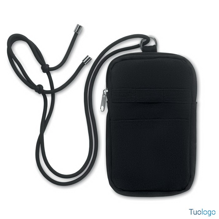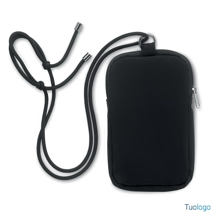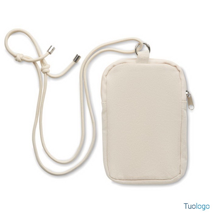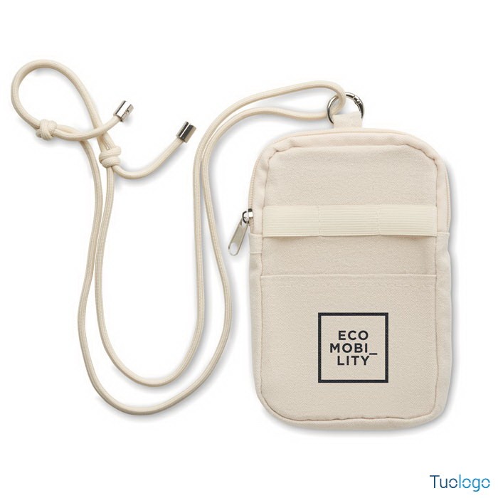 Borsa cross body per smartphone Guamo. Borsa cross body per smartphone in cotone riciclato con cordino regolabile in poliestere RPET e tasca aperta sul lato anteriore. 280 gr/m². Dimensioni: cm 12x19.