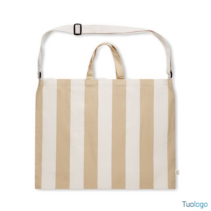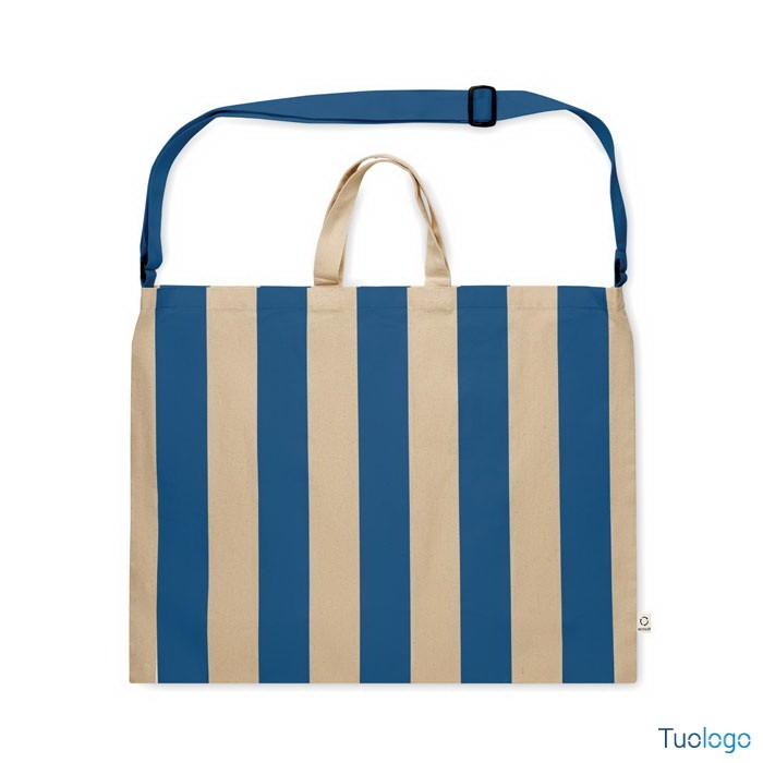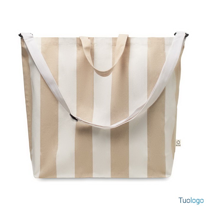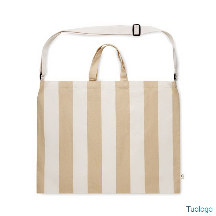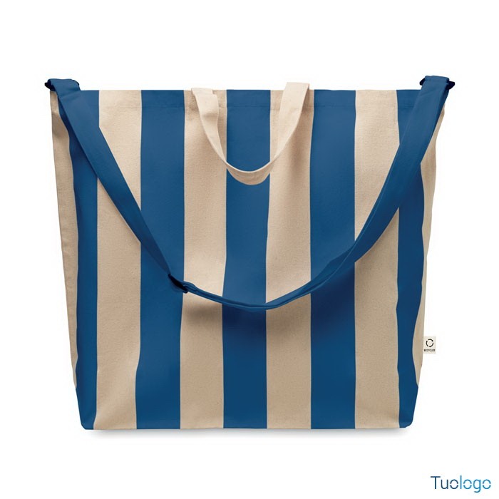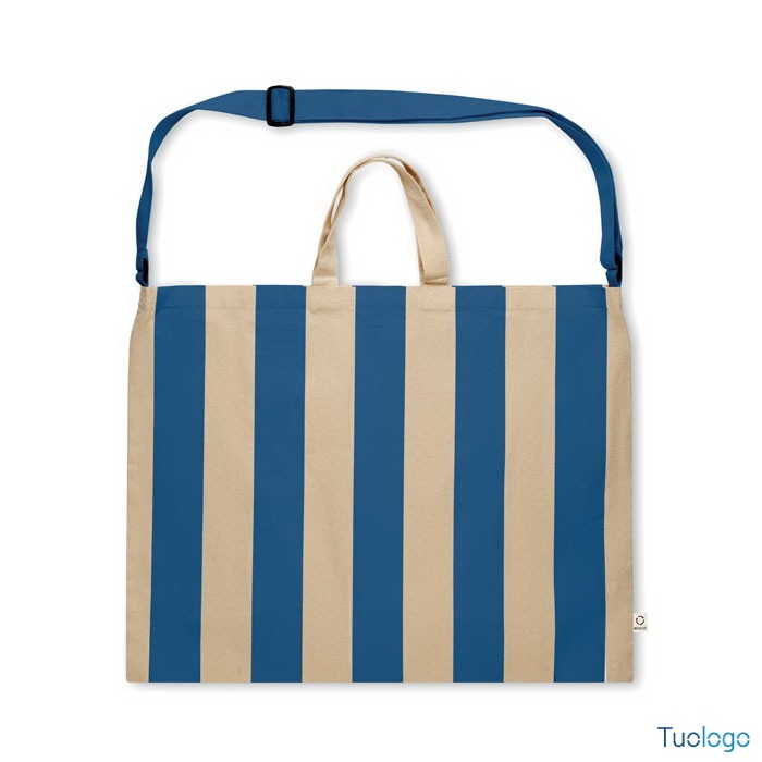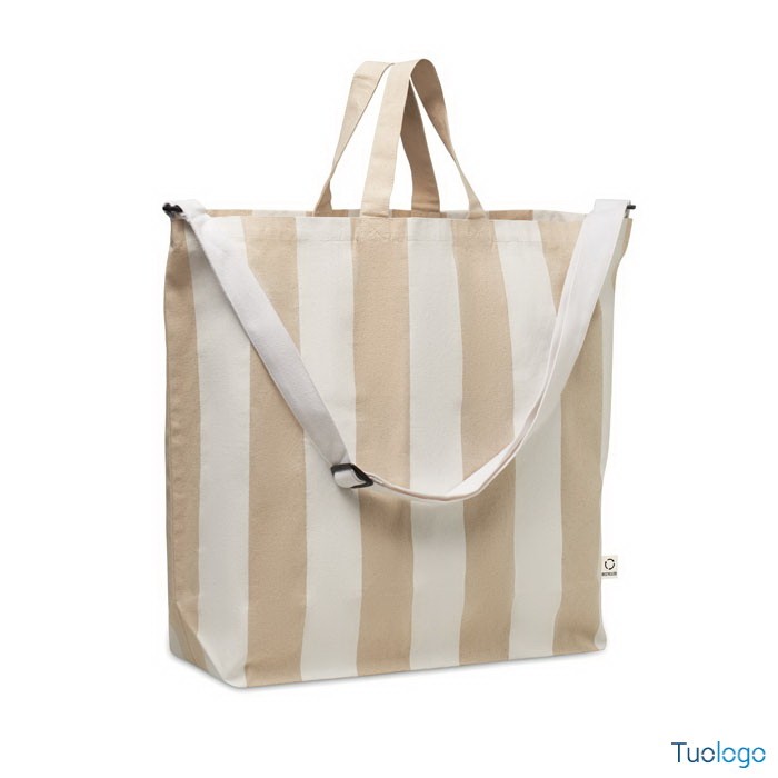 Borsa da spiaggia extra large Ibama. Borsa da spiaggia extra large a righe in cotone riciclato (80%) e poliestere riciclato (20%) da 280 gr/m² con tasca interna. Manici corti e una grande tracolla regolabile.Dimensioni: cm 46x16x60.