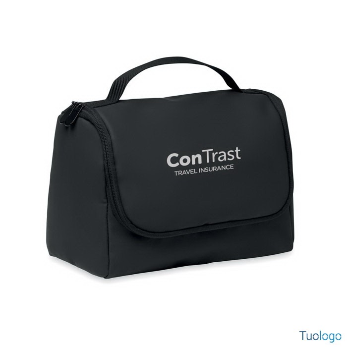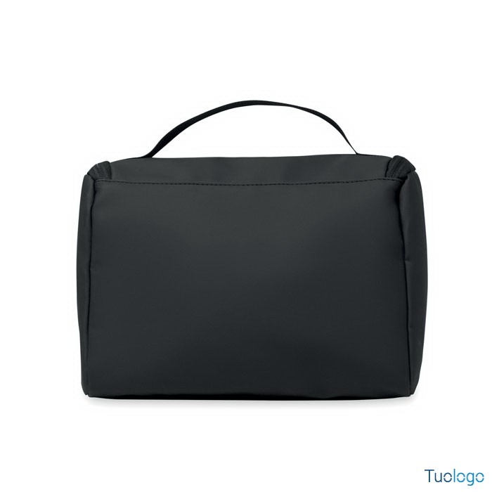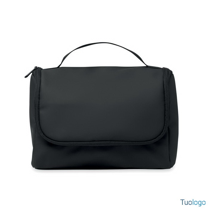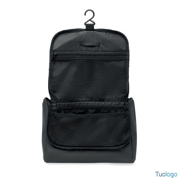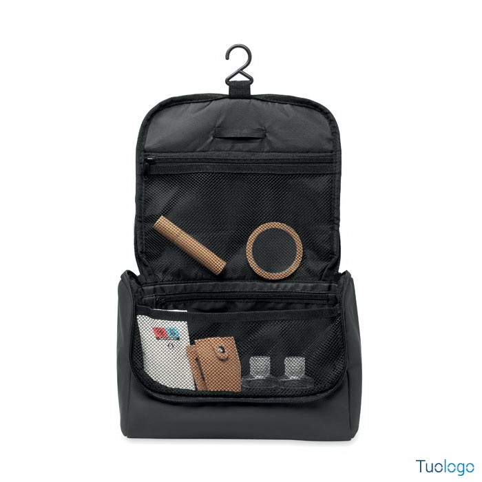 Borsa da viaggio Dracut. Borsa organizer per cosmetici in morbido PU con gancio per appendere e fodera in 210D RPET. Dimensioni: 26x15x18 cm. Un ampio scomparto principale con scomparto interno in rete con cerniera e 1 scomparto in rete.