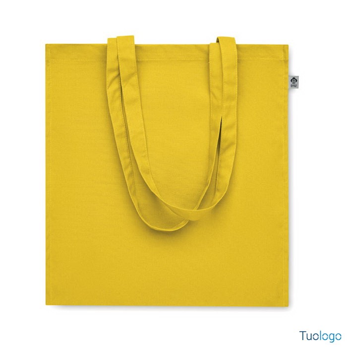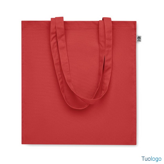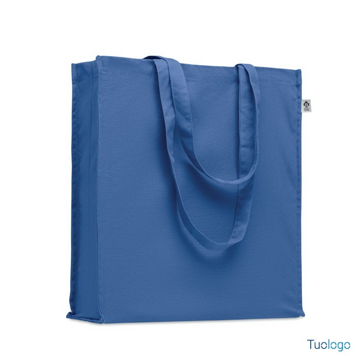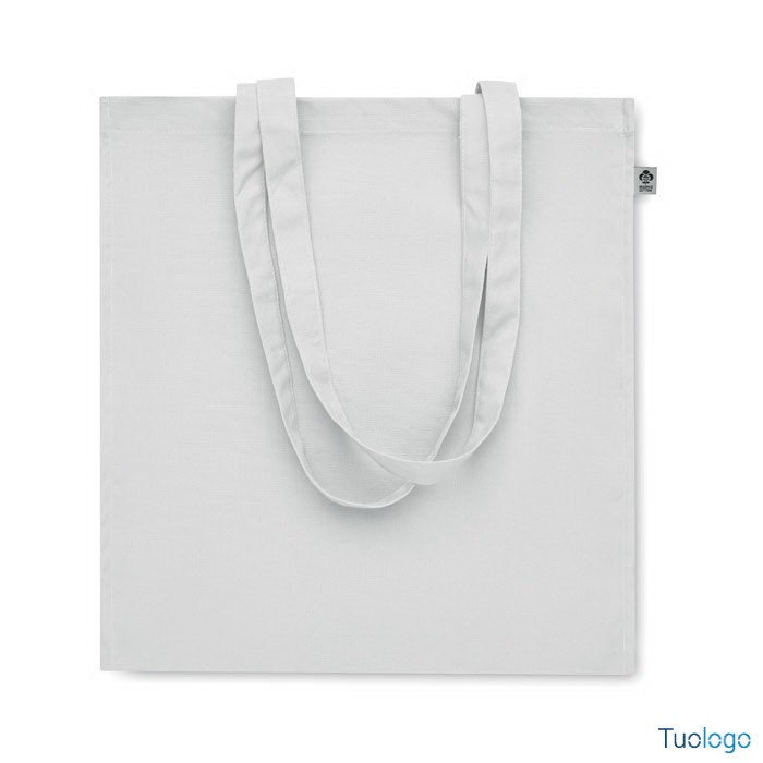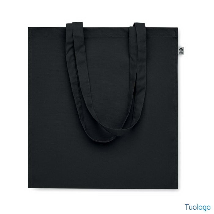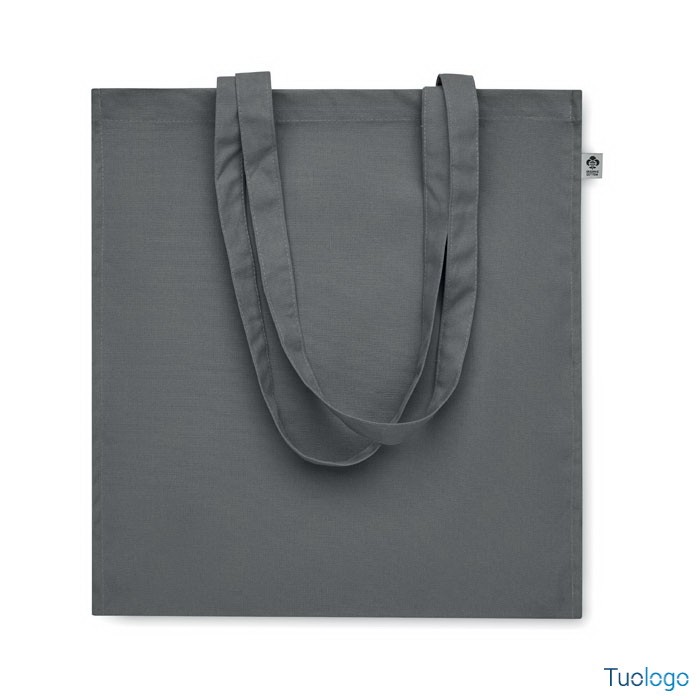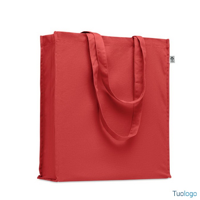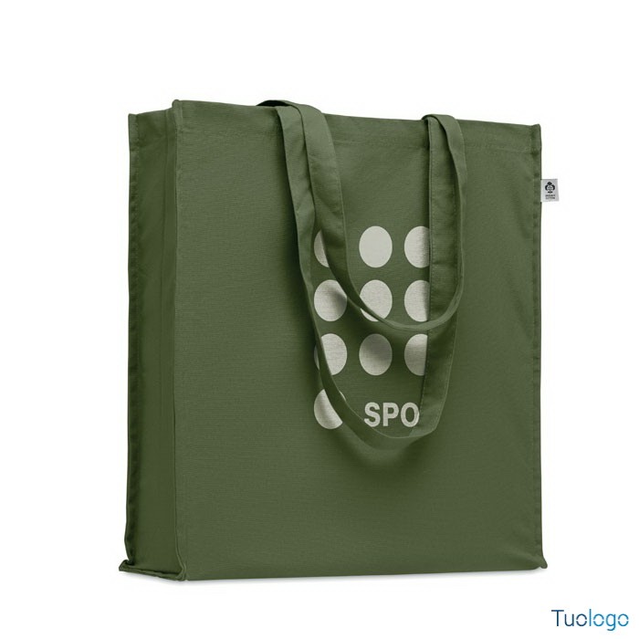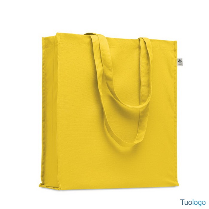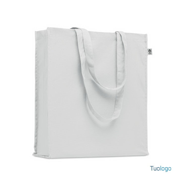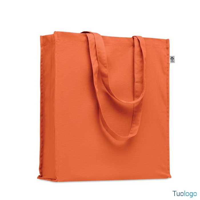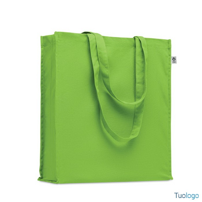 Borsa shopper manici lunghi Sorbara. Shopper in cotone biologico con manici lunghi e soffietto. 220 gr. Dimensioni: cm 38x9x42.