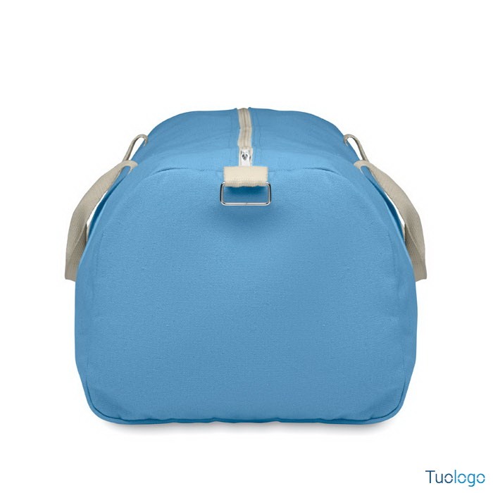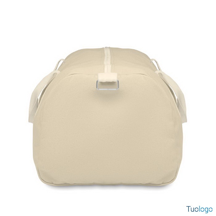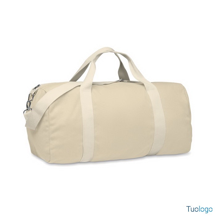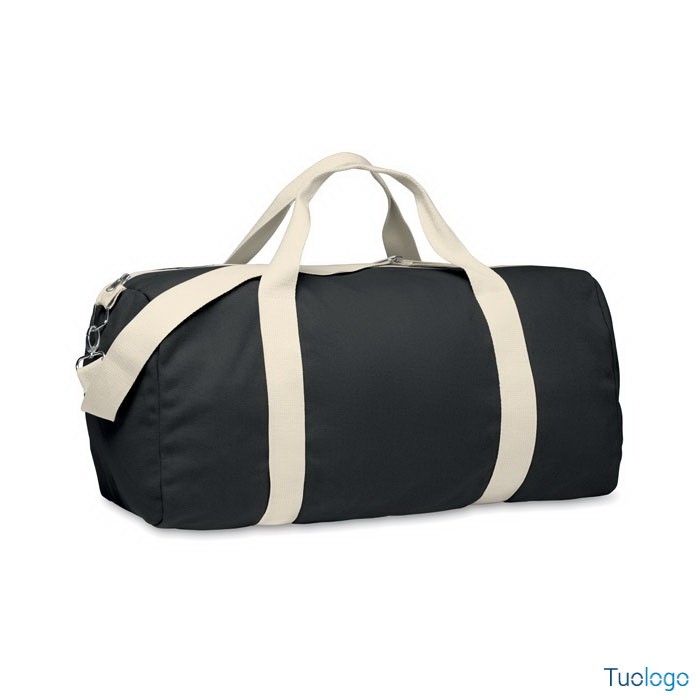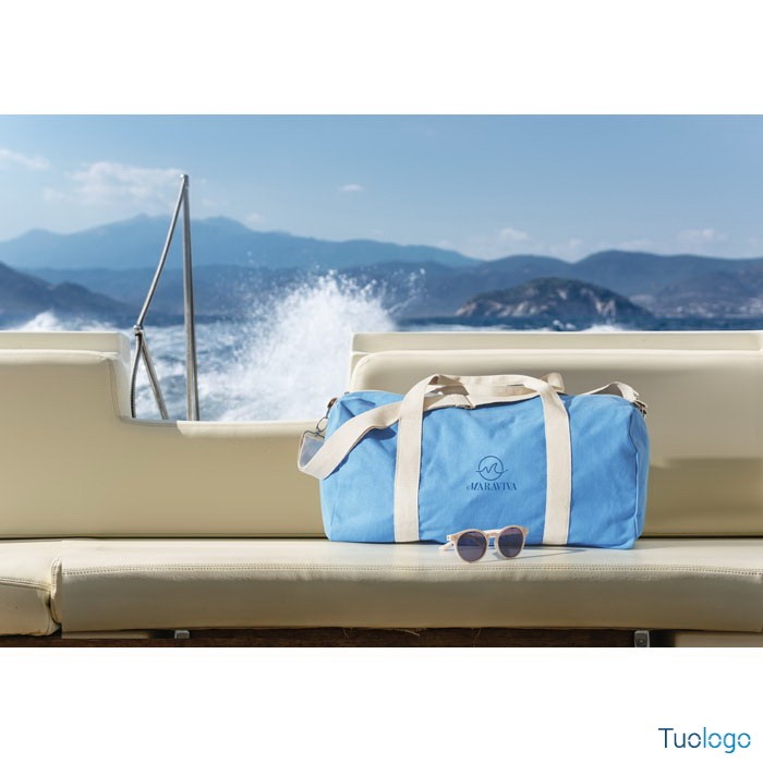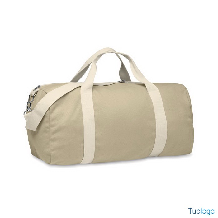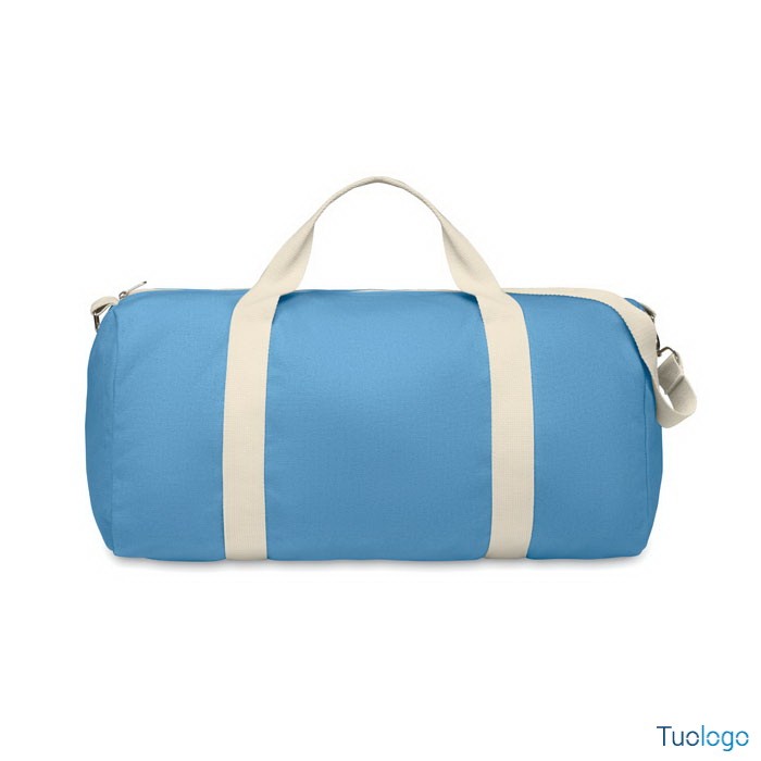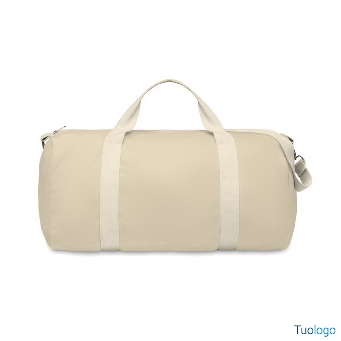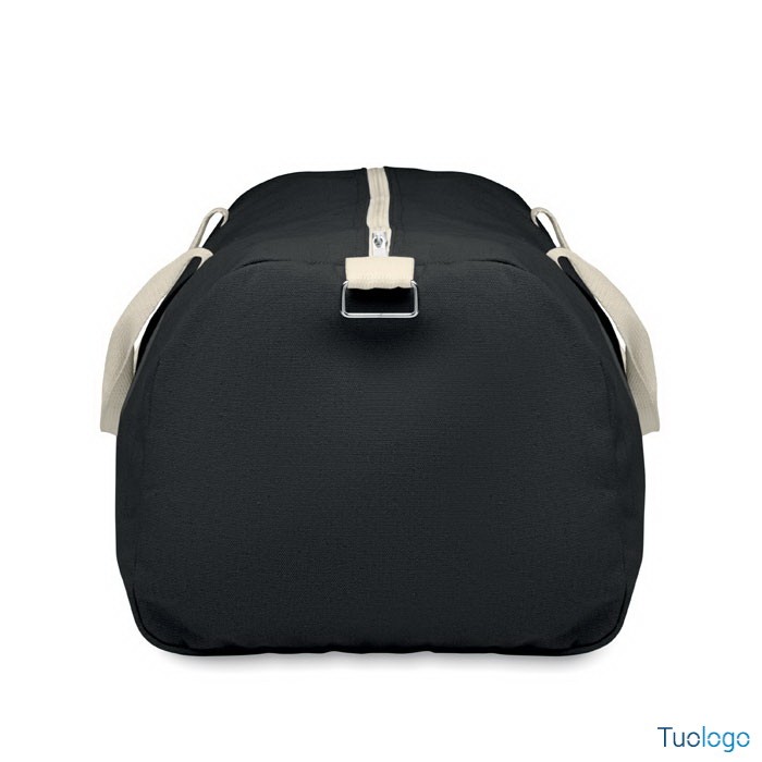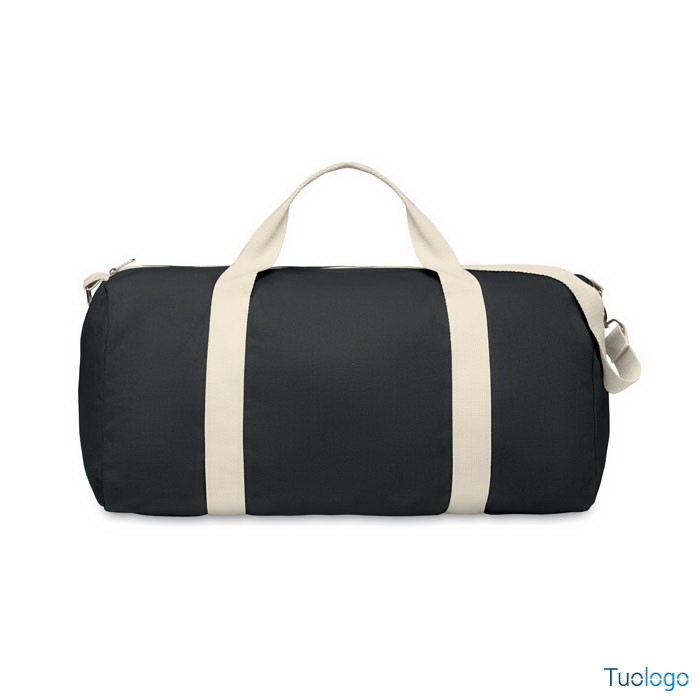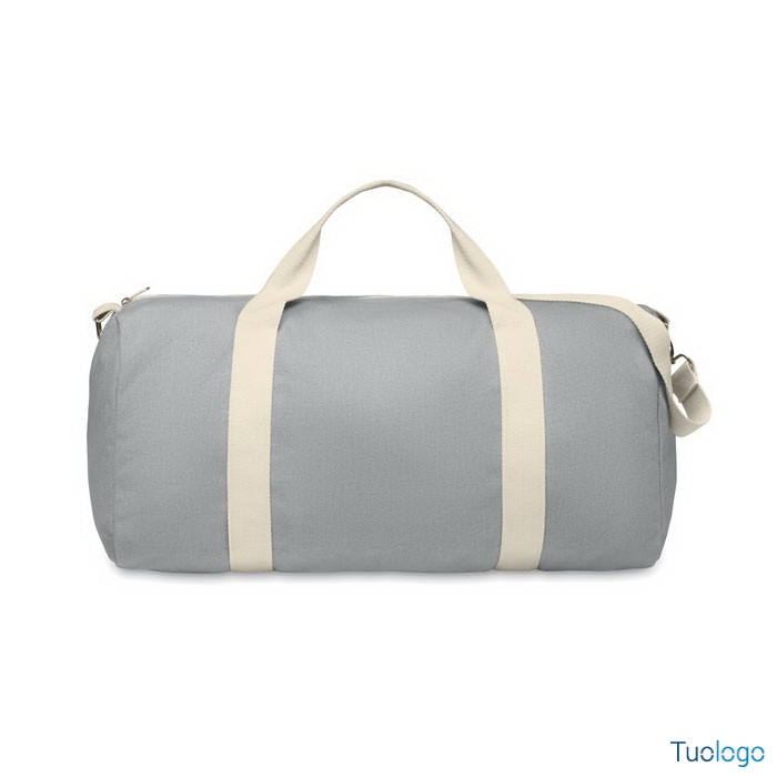 Borsone in tessuto riciclato Zàrate. Borsone in tessuto riciclato (60% cotone riciclato, 40% poliestere riciclato) da 320 gr/m² con manico in fettuccia di cotone naturale e tracolla regolabile e staccabile. Dimensioni: cm 49x26x24.