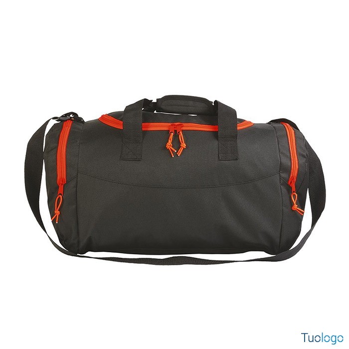 Borsone nero con tre zip arancioni e tracolla nera su sfondo bianco, 2 manici neri.