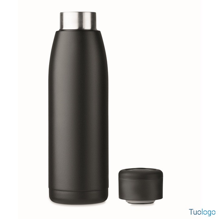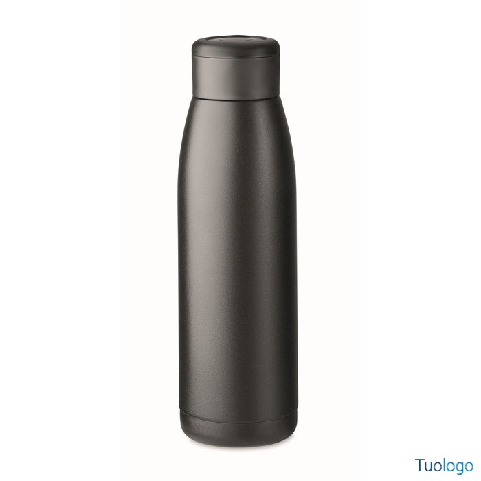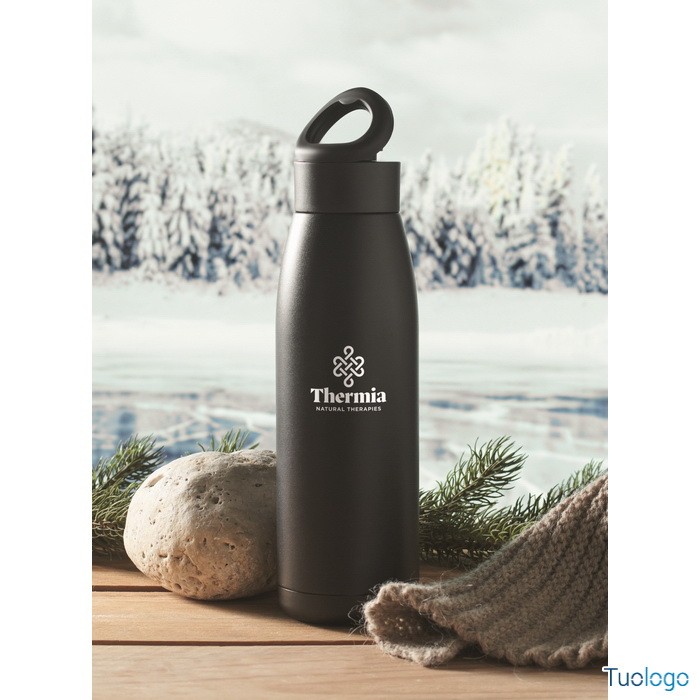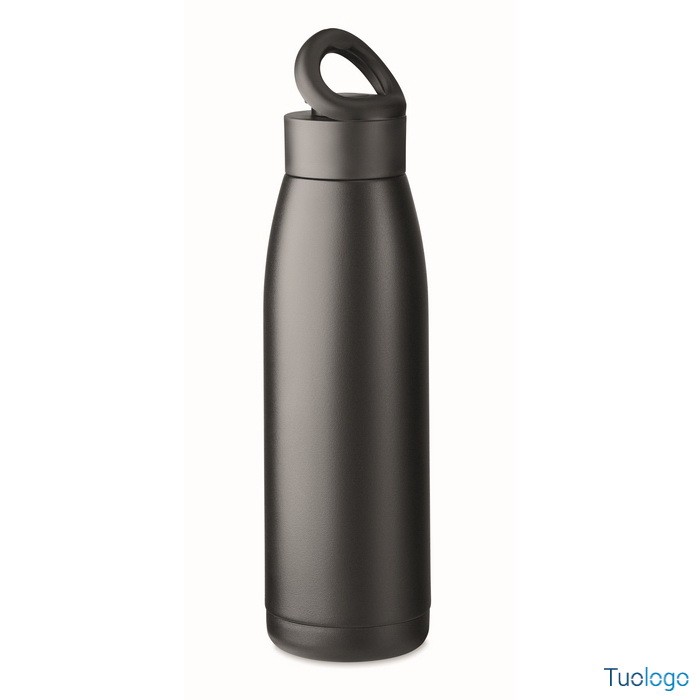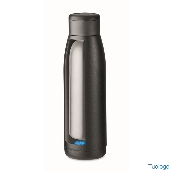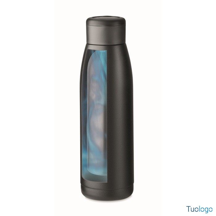 Bottiglia Lefri. Bottiglia doppio strato in acciaio inox riciclatocoperchio ad anello in morbido silicone. Agitando la bottiglia, la temperatura della superficie cambia in caldo o freddo. Dimensioni: cm 6X22