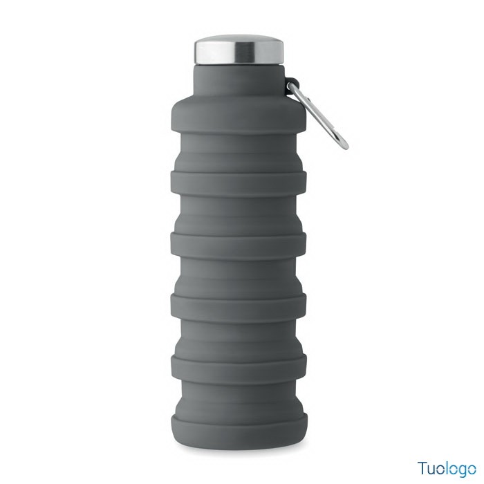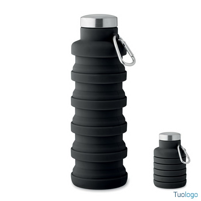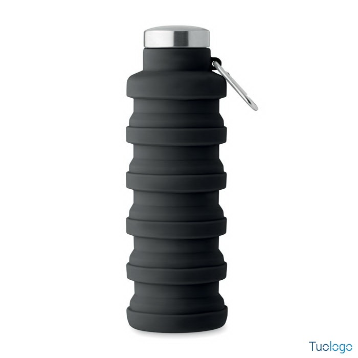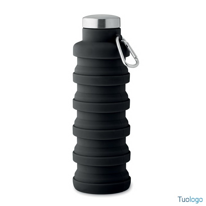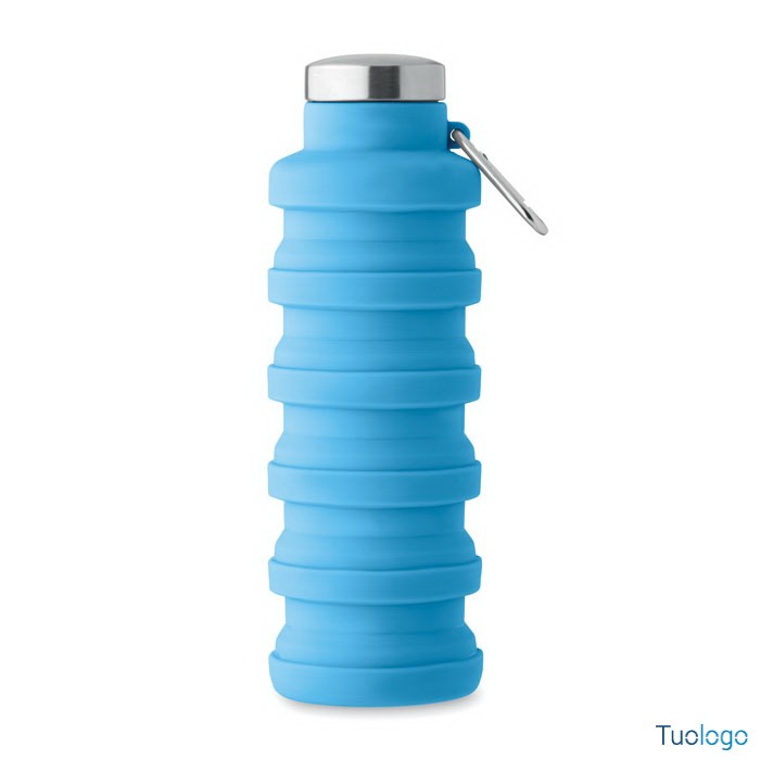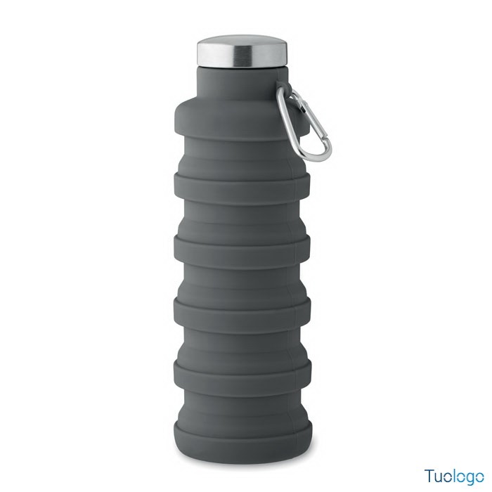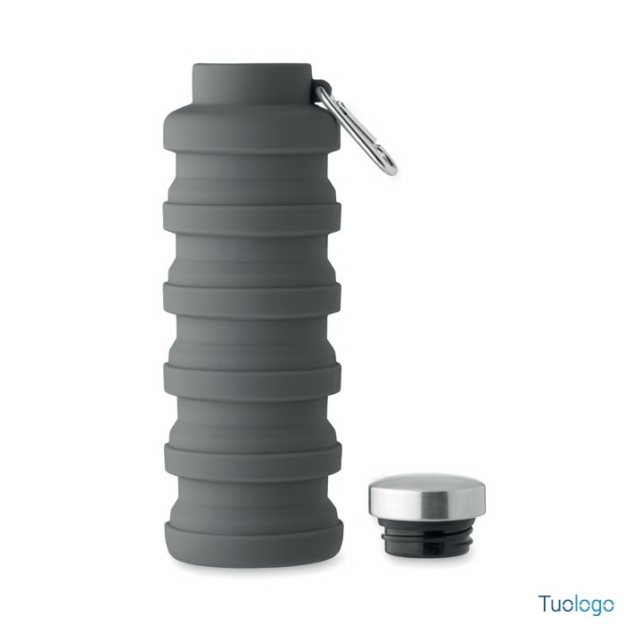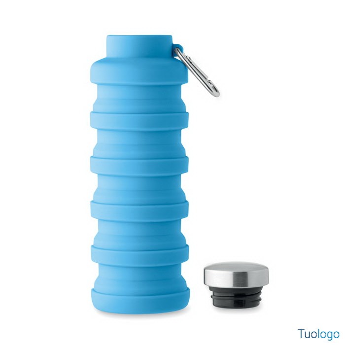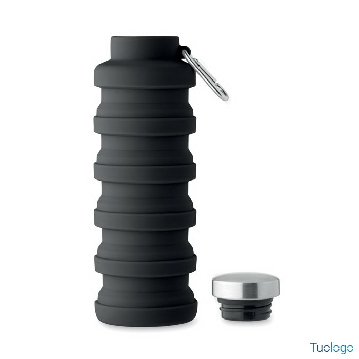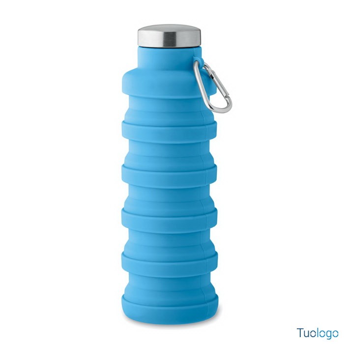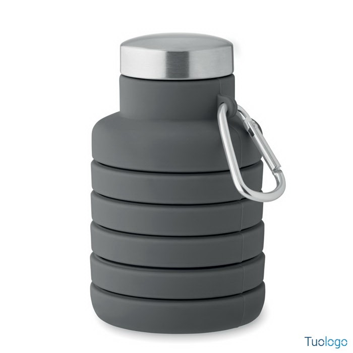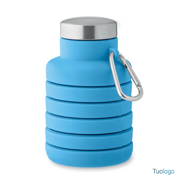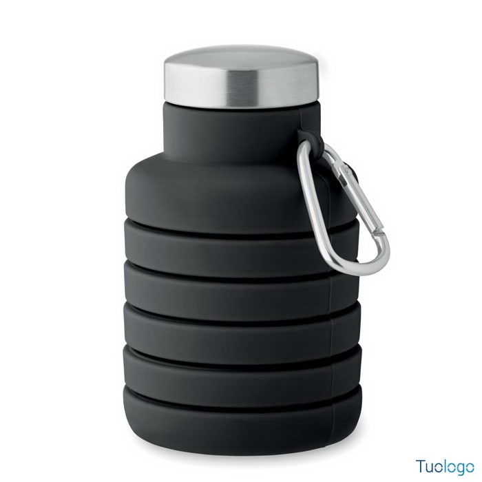 Bottiglia pieghevole in silicone Falan. Bottiglia pieghevole in silicone con coperchio in acciaio inox e moschettone in alluminio. Dimensioni: diam cm 6,5x21.