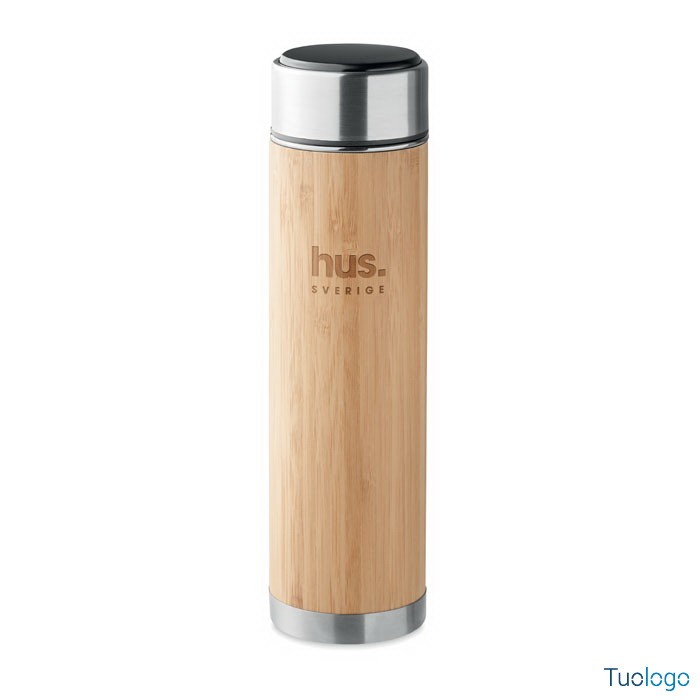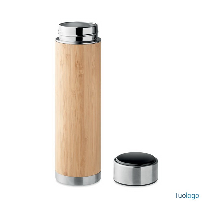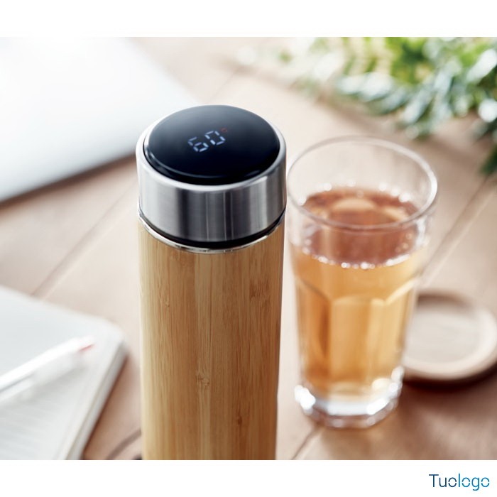 Bottiglia termica 480 ml Montecelio. In acciaio inossidabile isolato a doppio strato e bamboo. termometro touch LED nel coperchio. 1 batteria CR 2450 sostituibile inclusa. Infusore per te e tisane. Dimensioni: diam cm 6,4x23,5.