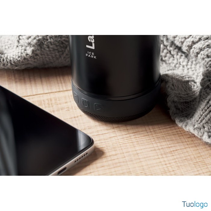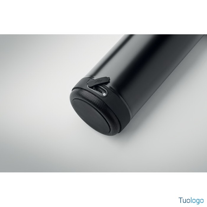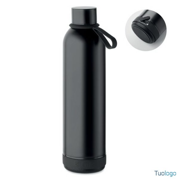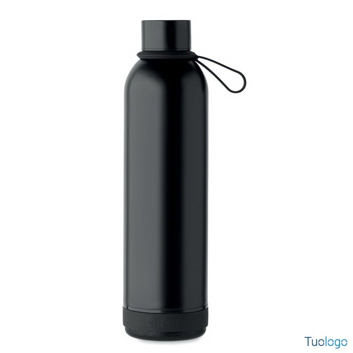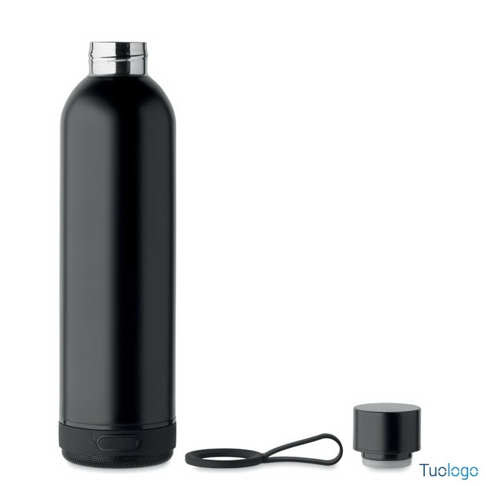 Bottiglia termica 500ml Miseu. Bottiglia isolante a doppio strato in acciaio inox riciclato, manico per trasporto in silicone con speaker wireless da 3W removibile. 500 ml. Batteria: 500 mAh. Dimensioni: cm 7,2x27.