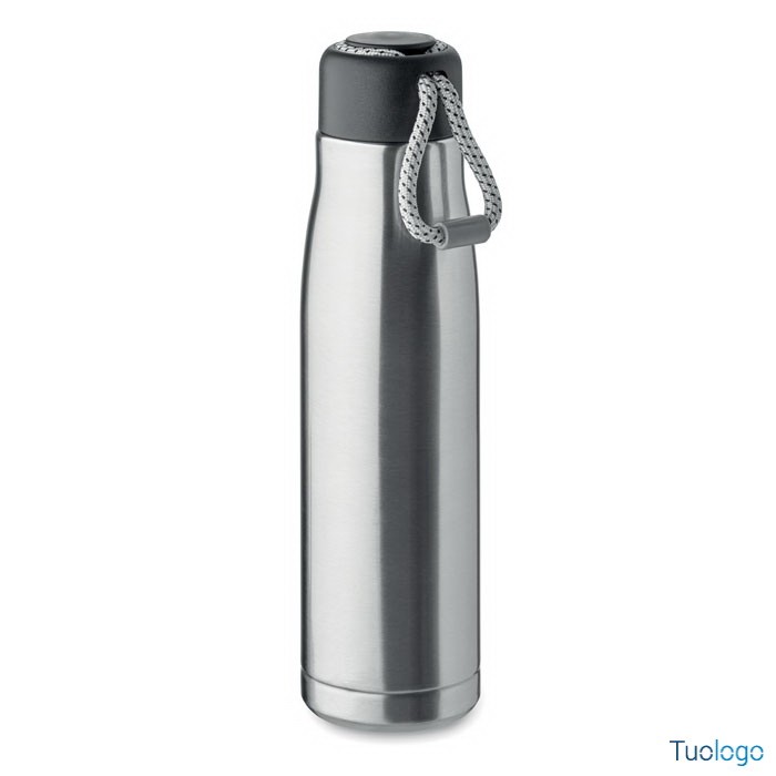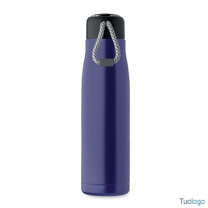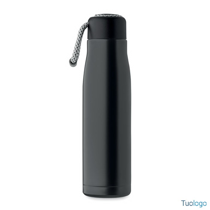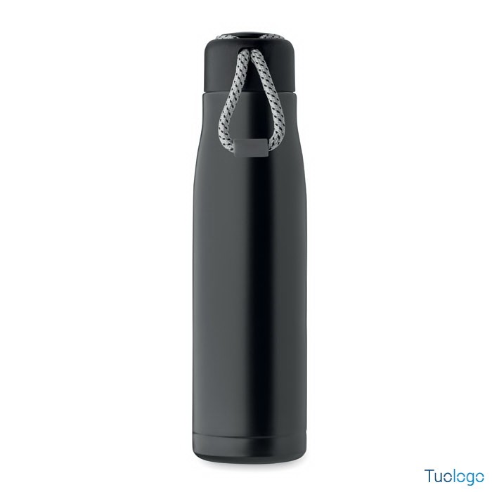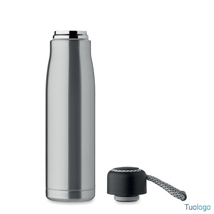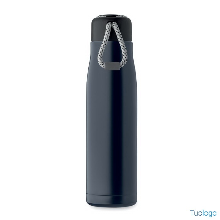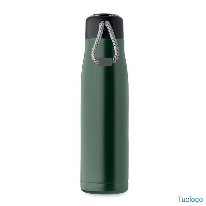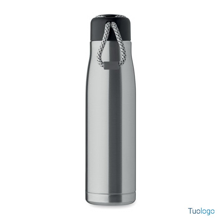 Bottiglia termica 500ml Tassi. Bottiglia sottovuoto isolata a doppio strato in acciaio inox riciclato con impugnatura a corda integrata sul coperchio in PP. Senza perdite. 500 ml. Dimensioni: cm 6.5x25.