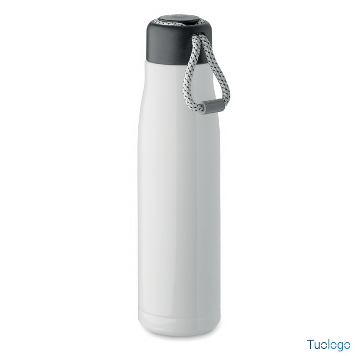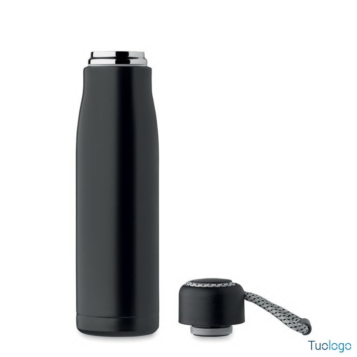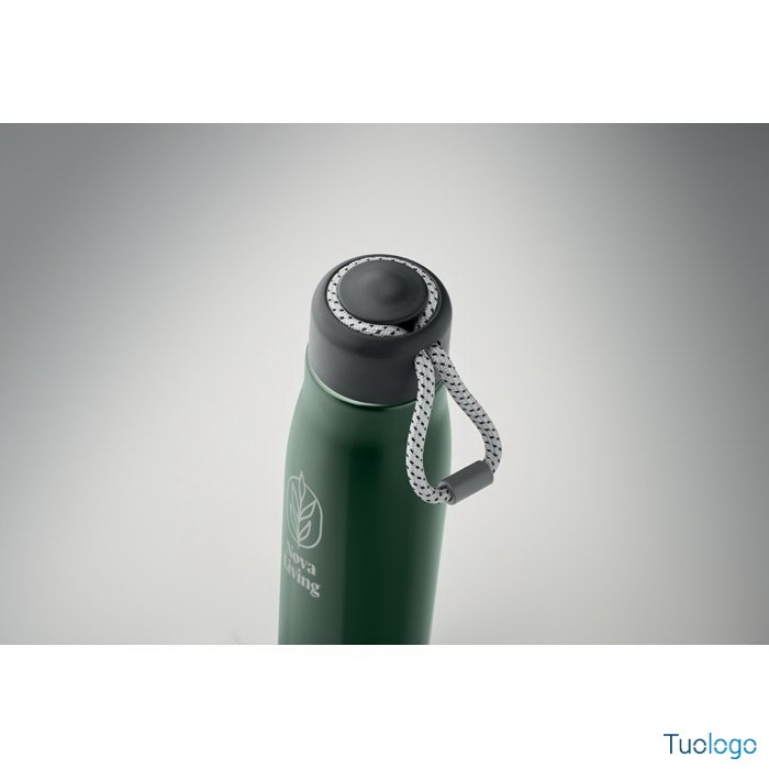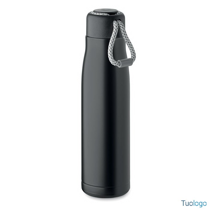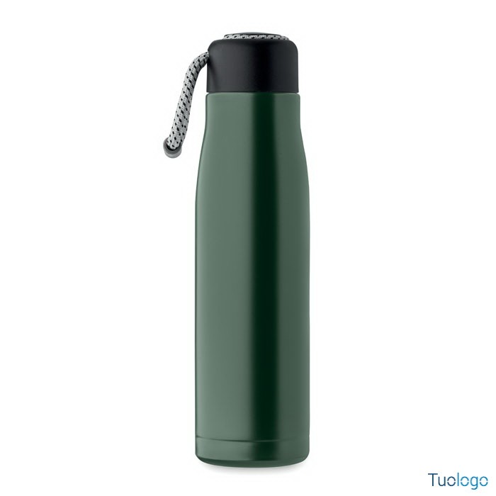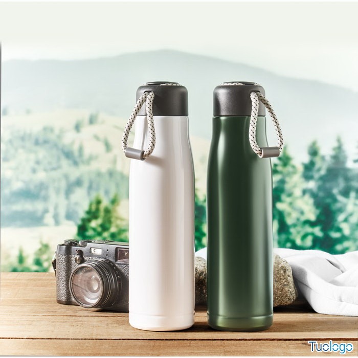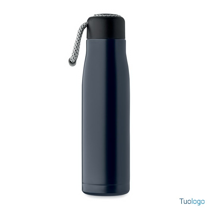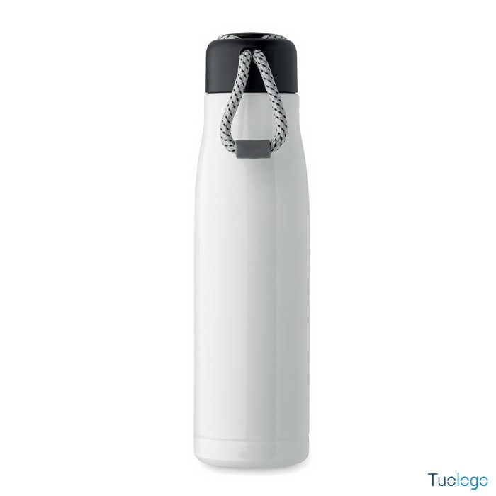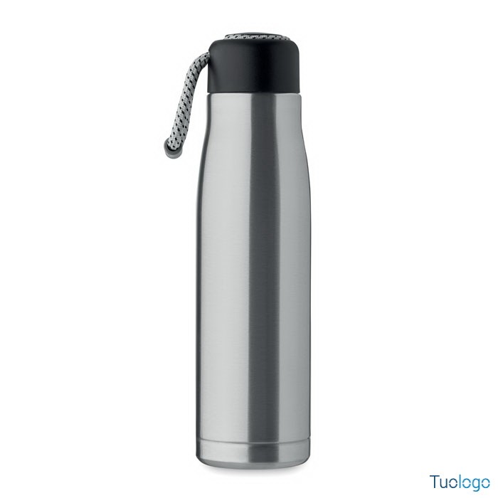 Bottiglia termica 500ml Tassi. Bottiglia sottovuoto isolata a doppio strato in acciaio inox riciclato con impugnatura a corda integrata sul coperchio in PP. Senza perdite. 500 ml. Dimensioni: cm 6.5x25.