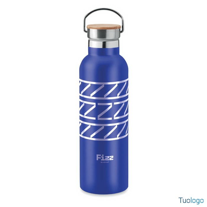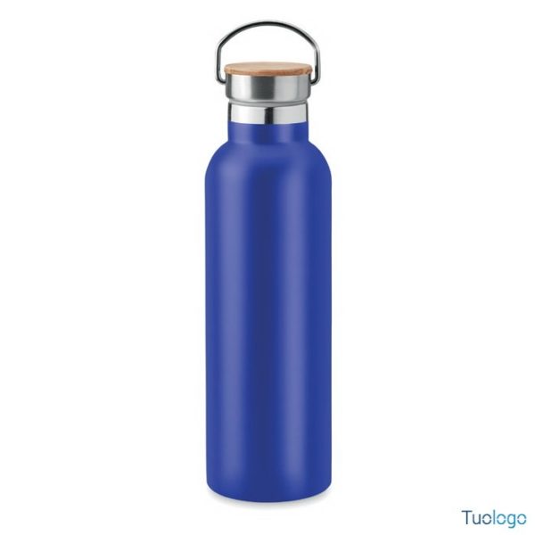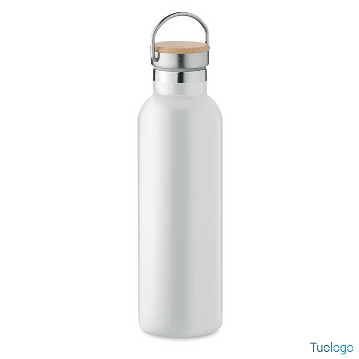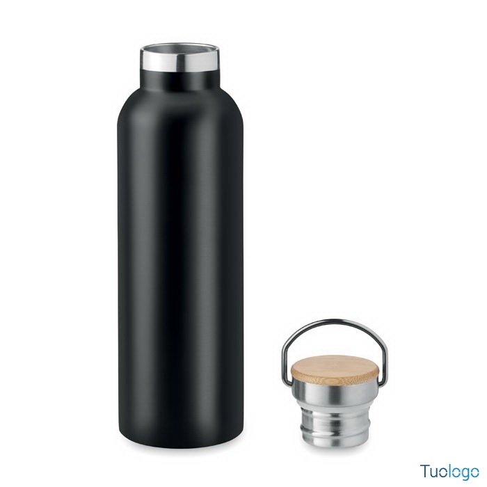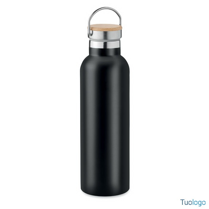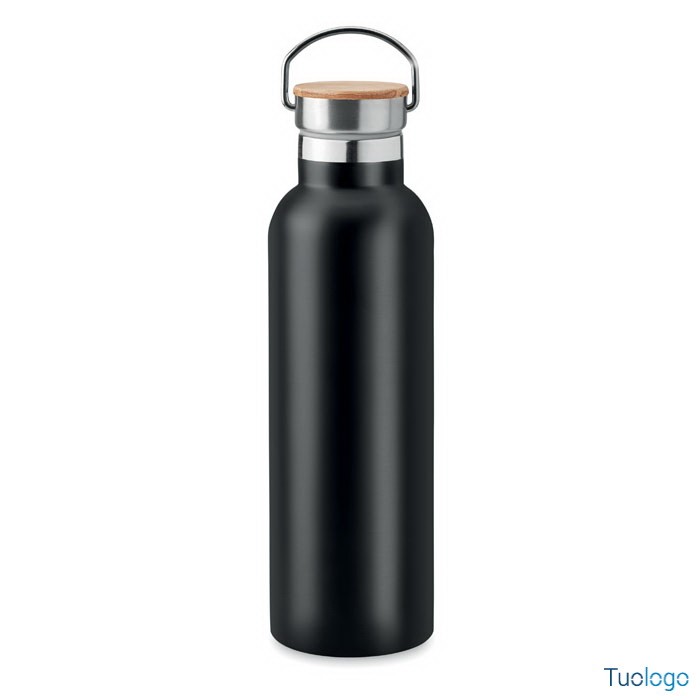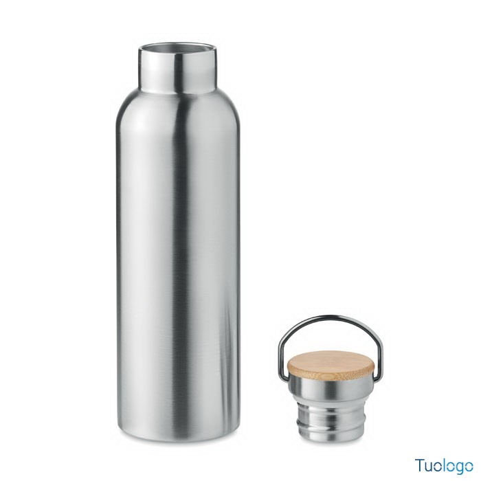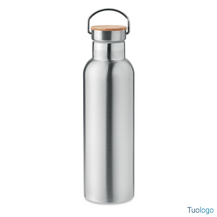 Bottiglia termica 750 ml Esine. Doppio strato in acciaio inox con tappo in bamboo e manico per il trasporto. Dimensioni: diam cm 7x26.