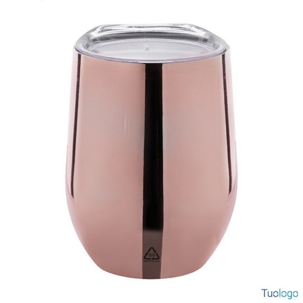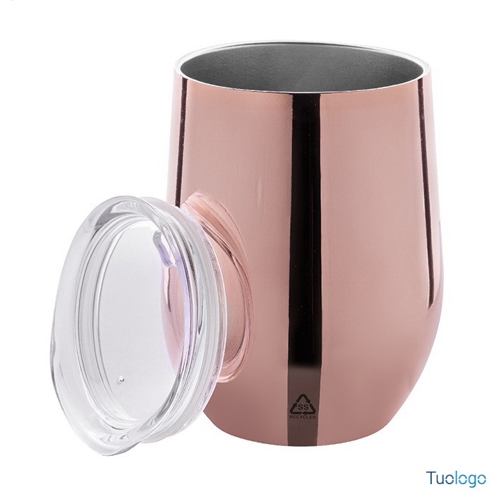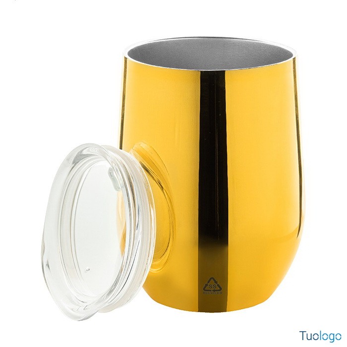 Bottiglia termica Mits. Tazza termica a doppia parete da 350 ml. in acciaio riciclato con finitura metallica lucida e coperchio in plastica. Dimensioni: cm 8,8x12.
