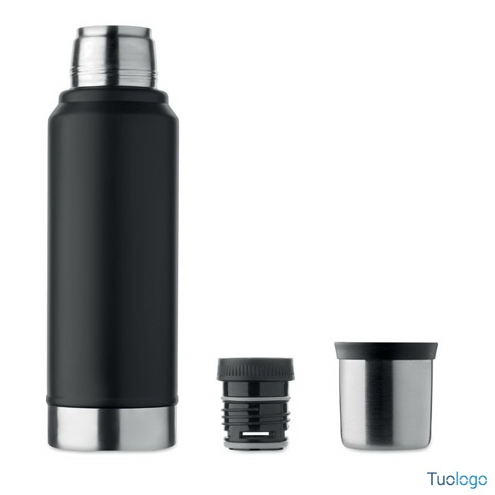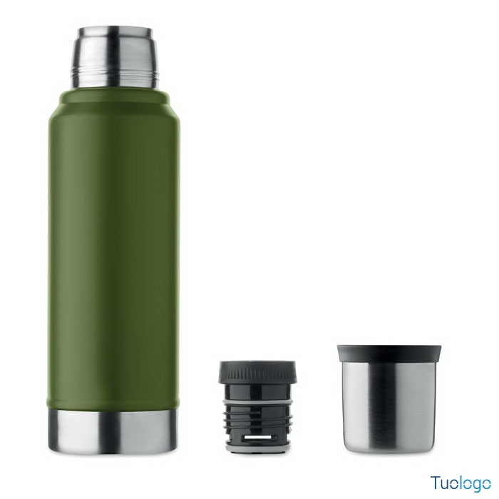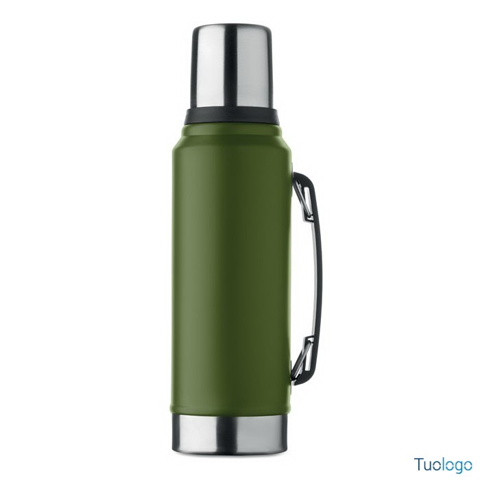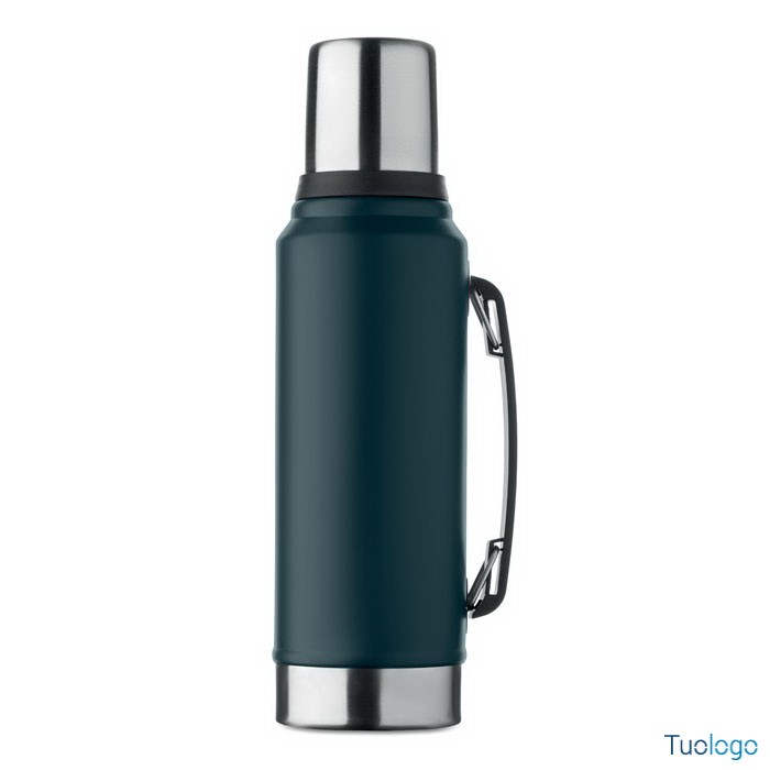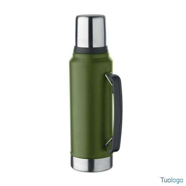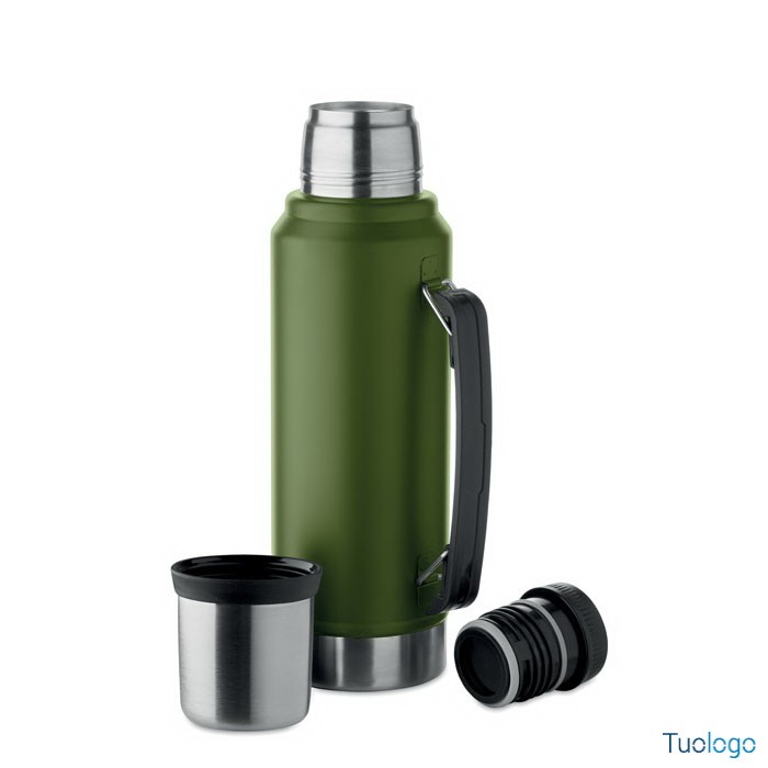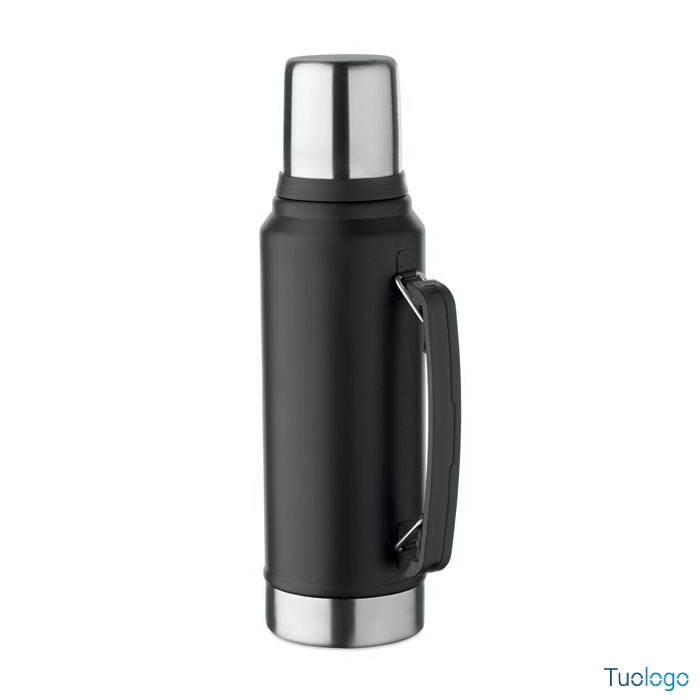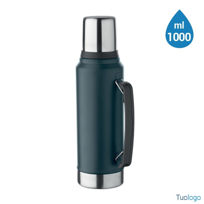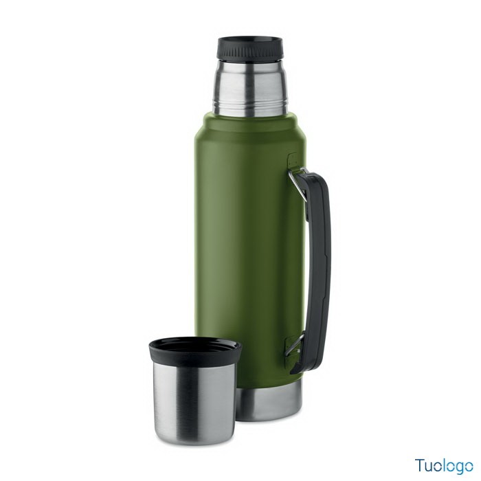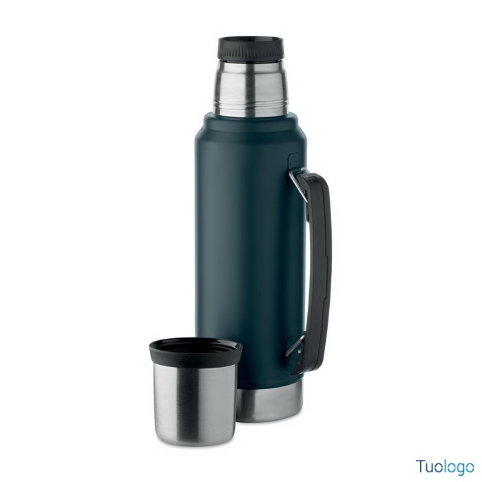 Bottiglia termica Vimpeli. Bottiglia a doppio strato in acciaio inox riciclato con maniglia laterale. Con coperchio in PP e tazza in acciaio. 1L. Dimensioni: 13x9x33 cm.