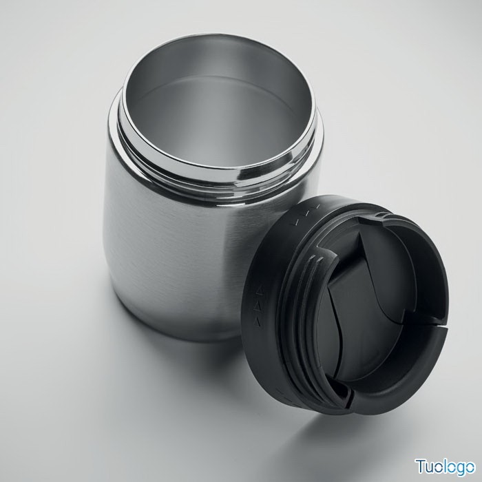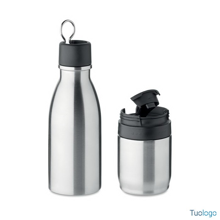 Bottiglia thermos 500 ml 2 in 1. In acciaio inox, a doppia parete, con bicchiere removibile. Capacità: bottiglia 500 ml bicchiere 310 ml. Dimensioni: diam cm 7,5x31,5.