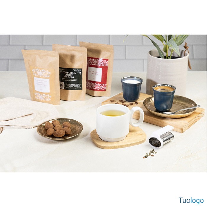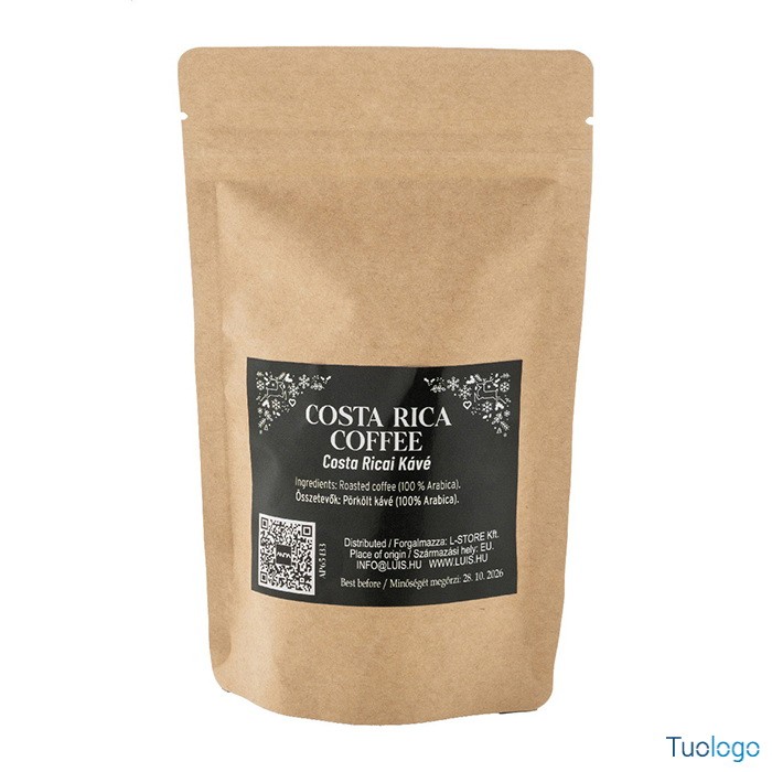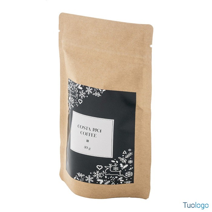 Caffe confezionato Bunja. Caffe della Costa Rica tostato in grani e confezionato in un sacchetto di cartoncino kraft. 40 grammi. Dimensioni: cm 9x18,3x4,7.