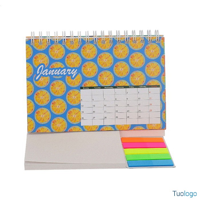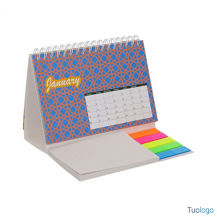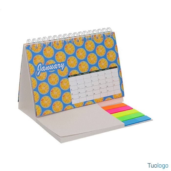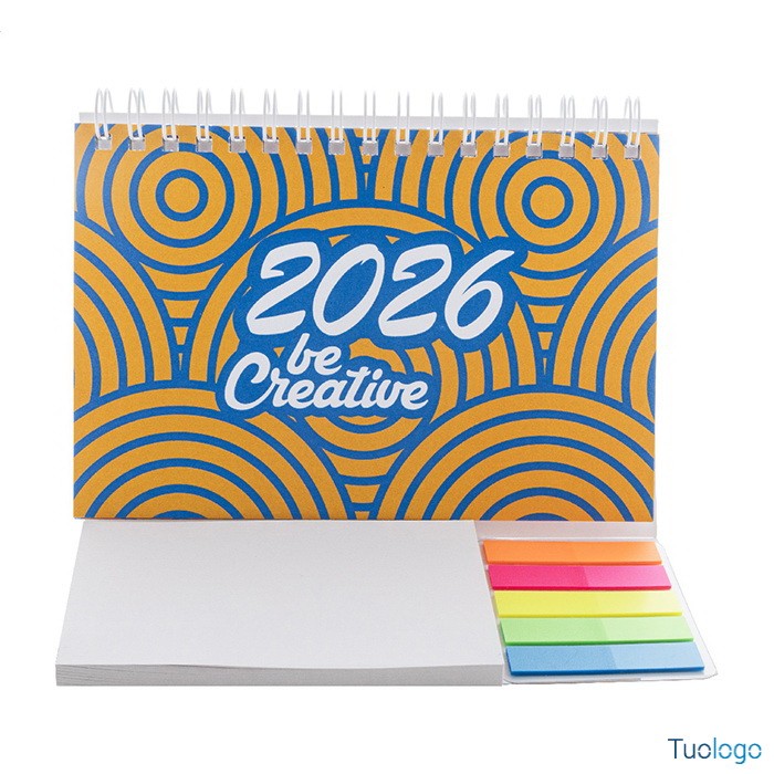 Calendario Glenan. Calendario da tavolo da 12 fogli con rilegatura a spirale, personalizzabile con grafica a colori su supporto verticale. Comprende 50 foglietti adesivi carta riciclata. Dimensioni: cm 15x11,5x13,5.