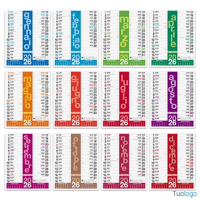 Calendario Olandese Color. Mensile 12 fogli, carta patinata 70 gr, testata termosaldata, festività internazionali. Il prezzo include la stampa a un colore. Dimensioni: cm 30x47.