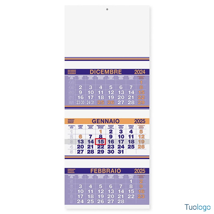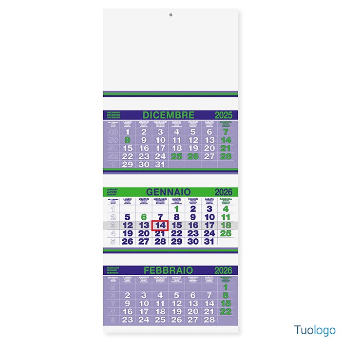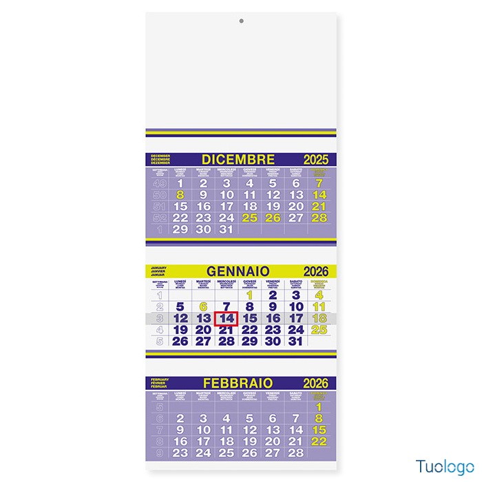 Calendario Trittico Fluo. Trimestrale 12 fogli, cursore incluso già montato, carta naturale 70 gr, testata rinforzata, tre blocchi dorsati e perforati. Il prezzo include la stampa a un colore. Dimensioni: cm 33x79.