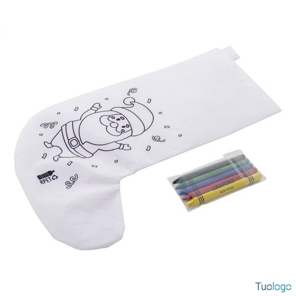 Calza natalizia Spruce. Calza a tema natalizio da colorare in tessuto non tessuto RPET con 5 pastelli. Dimensioni: cm 21,5x30,5.