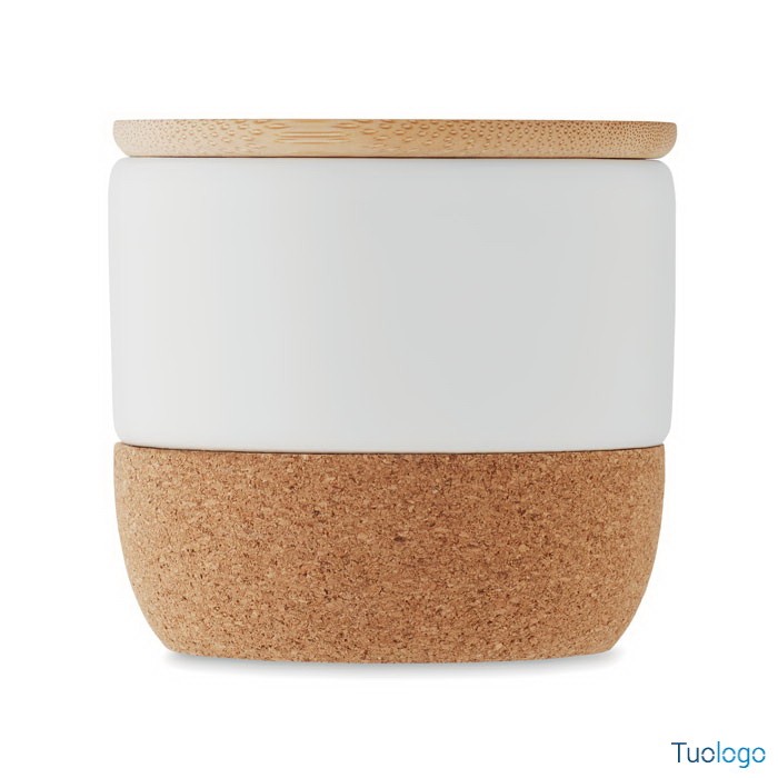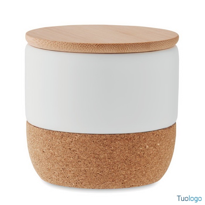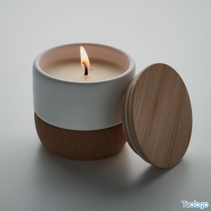 Candela profumata. A base di cera vegetale in vaso di gres con coperchio in bamboo e base in sughero. 80 gr. Tempo di combustione: 7,5 ore. Aroma lino fresco. Dimensioni: diam cm 7x6,6.