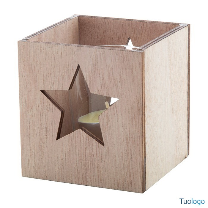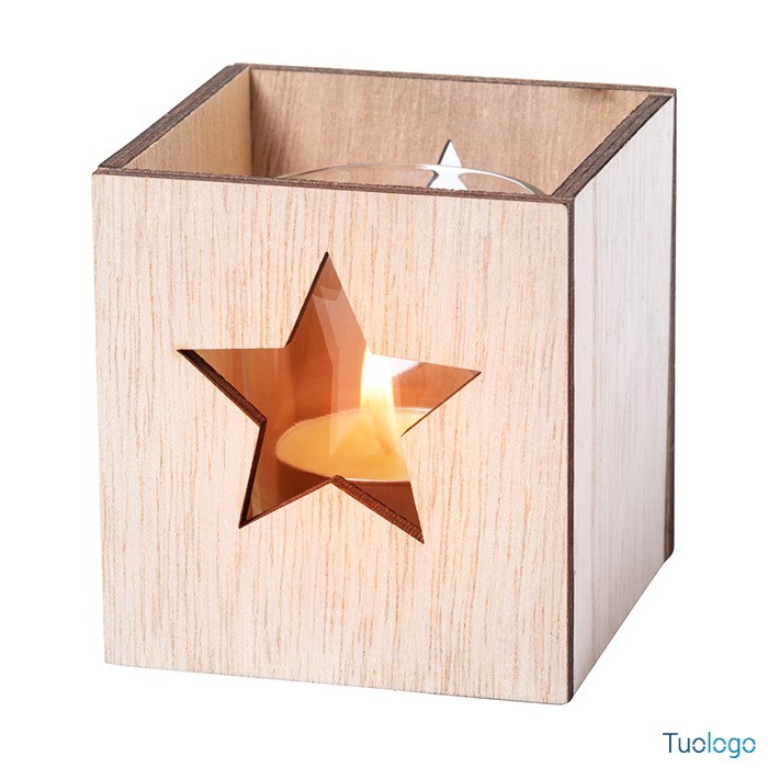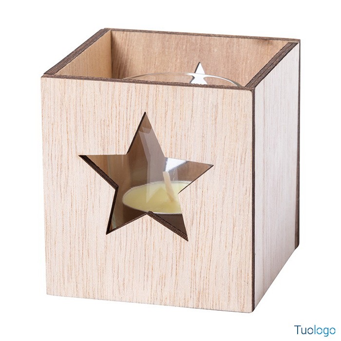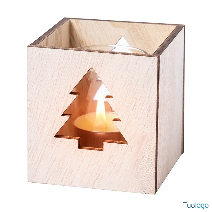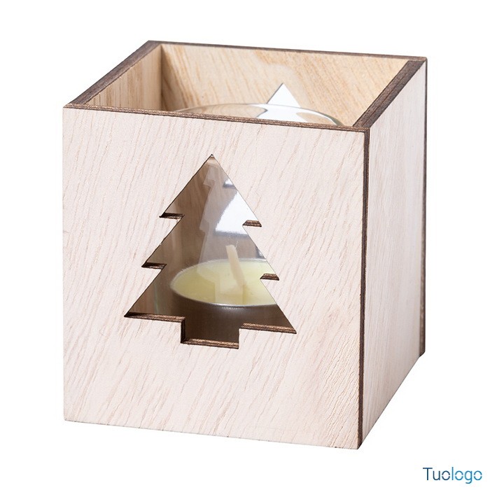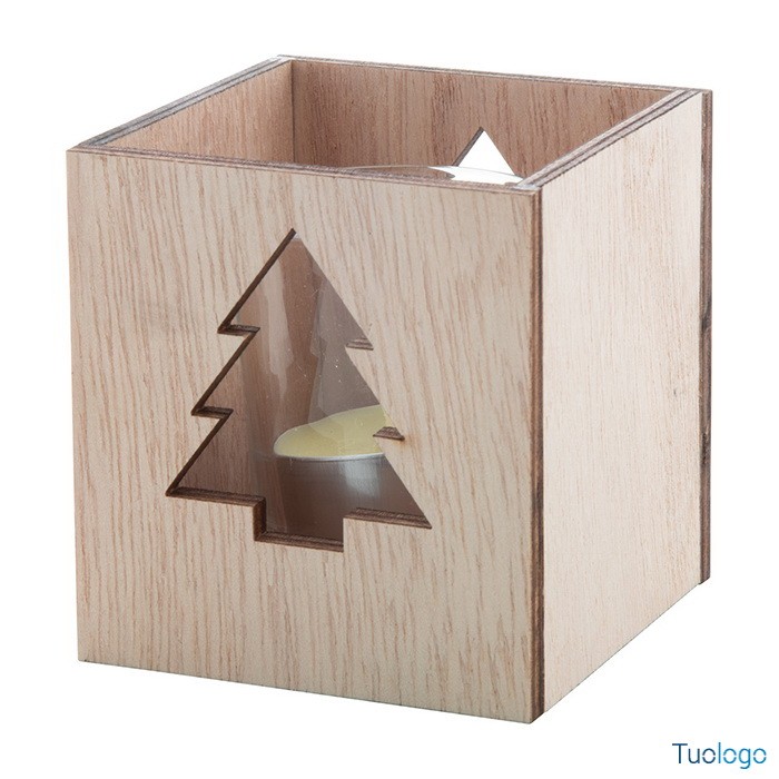 Candela Xayley. Candela tea light profumata alla vaniglia in barattolo di vetro e portacandela in legno con decorazione natalizia fustellata. Dimensioni: cm 7,5x8x7,5.
